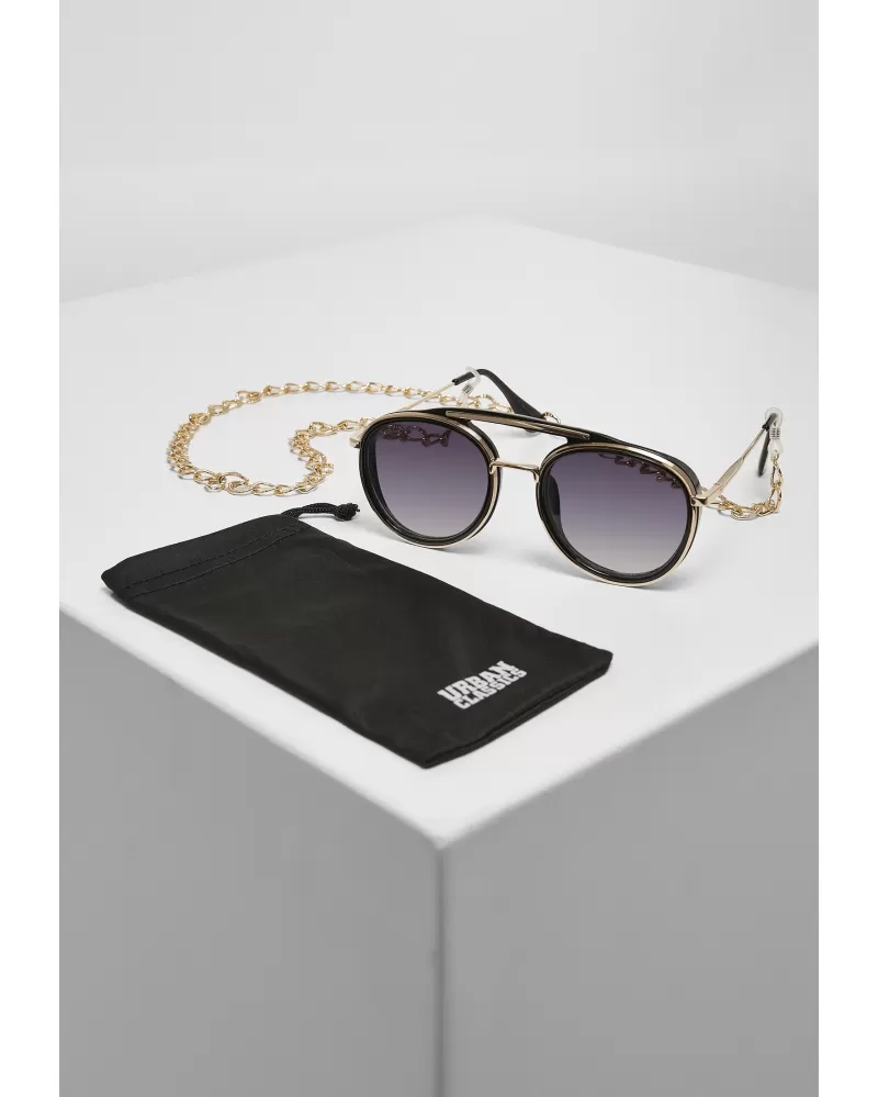 Tyto konzistentně vypadající sluneční brýle Urban Classics jsou opravdovým lákadlem pro léto. Téměř kulaté a tónované čočky nabízejí pevnou ochranu očí UV 400. Kovový rám s úzkými a rovnými stranami je jednoduchý a elegantní. Pouze oblast nosu je zdůrazněna dvojitým můstkem. Jako praktický doplněk jsou brýle dodávány spolu s doprovodným řetízkem. Pár slunečních brýlí se skládá z polykarbonátu, mědi a nerezové oceli.