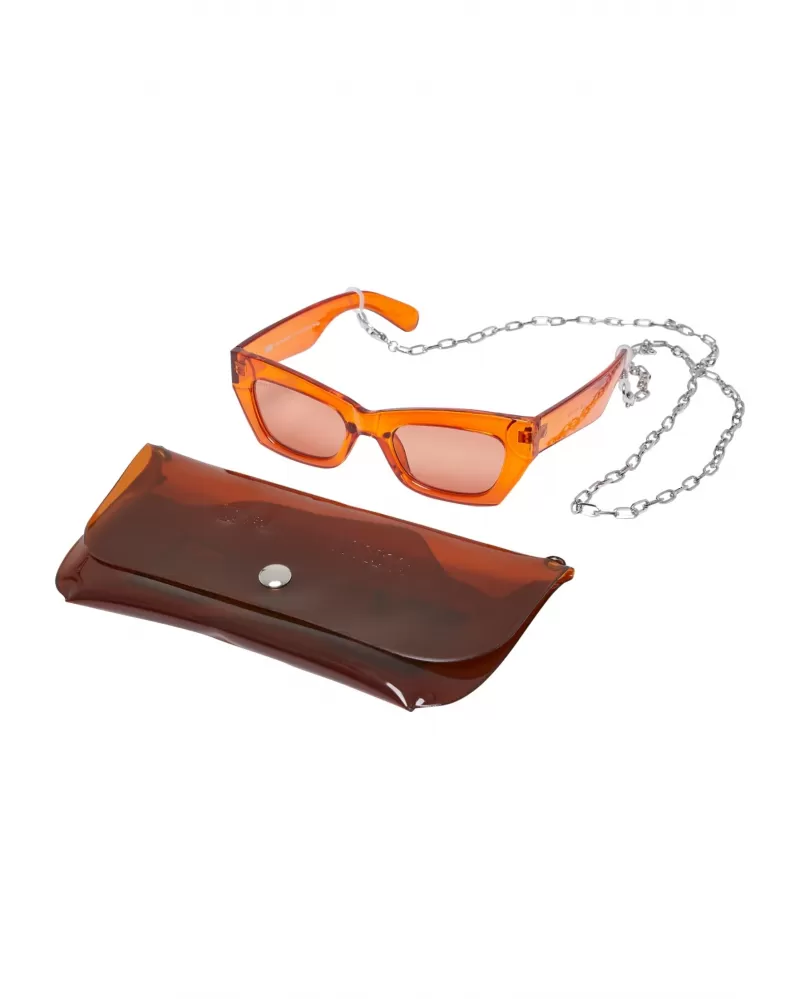 Sluneční brýle přesvědčí širokým, průhledným plastovým rámem a malými čočkami, připomínajícími ženský tvar kočičího oka. Jejich strany jsou široké a rovné a čočky jsou vybaveny UV 400 ochranou. Sluneční brýle jsou navíc vybaveny praktickým krytem se stahovacími šňůrkami a nápisem Urban Classics. Nahoře je zahrnuto další moderní pouzdro, které je vyrobeno z průhledného lesklého polyesteru a zavírá se na víko a patentku. Je také označena nápisem Urban Classics. Pouzdro je doplněno jemným kotevním řetízkem, který je odnímatelný a lze jej znovu nasadit na sluneční brýle.