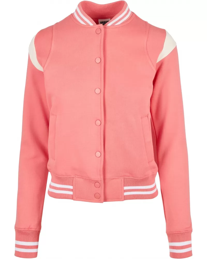 Dámská bunda URBAN CLASSICS TB2618  kombinuje sportovní vzhled s klasickými prvky a vytváří moderní hybrid. Mezi hlavní prvky patří dvojité pruhy na límci, manžetách a spodním lemu. Vložené pruhy v kontrastní barvě pod rameny dodávají stylu další dynamiku. Bundu lze bleskově zapnout pomocí matných leštěných kovových patentek. Sedí ležérně přes boky. Boční kapsy se zapínáním na druky. Elastické manžety a spodní lem s klasickými dvojitými pruhy. Nošení je příjemné a pohodlné. Je vhodná na klasické nošení ,na procházky,do školy, na sportovní utkání. Složení materiálu 63% bavlna, 37% polyester, fleece.