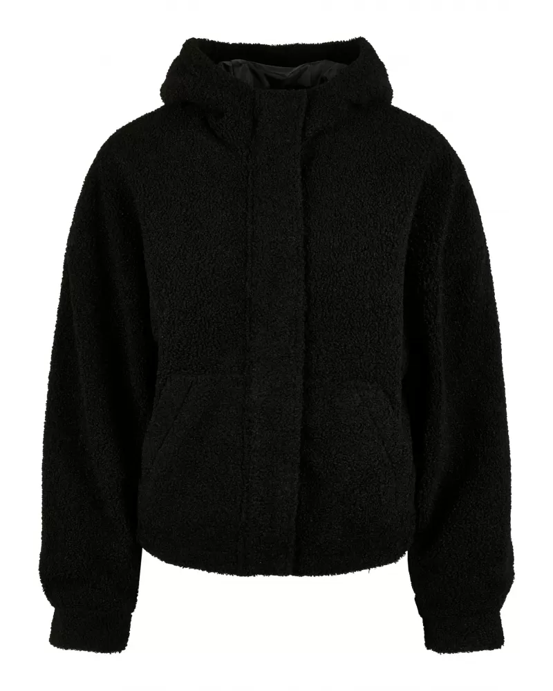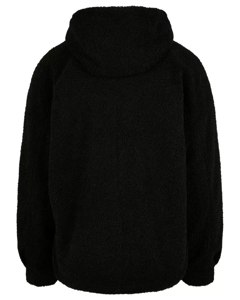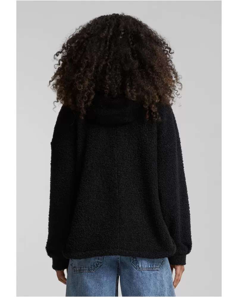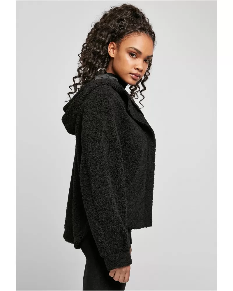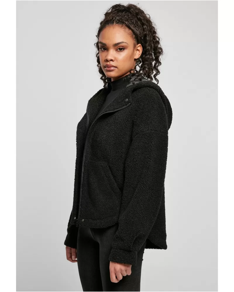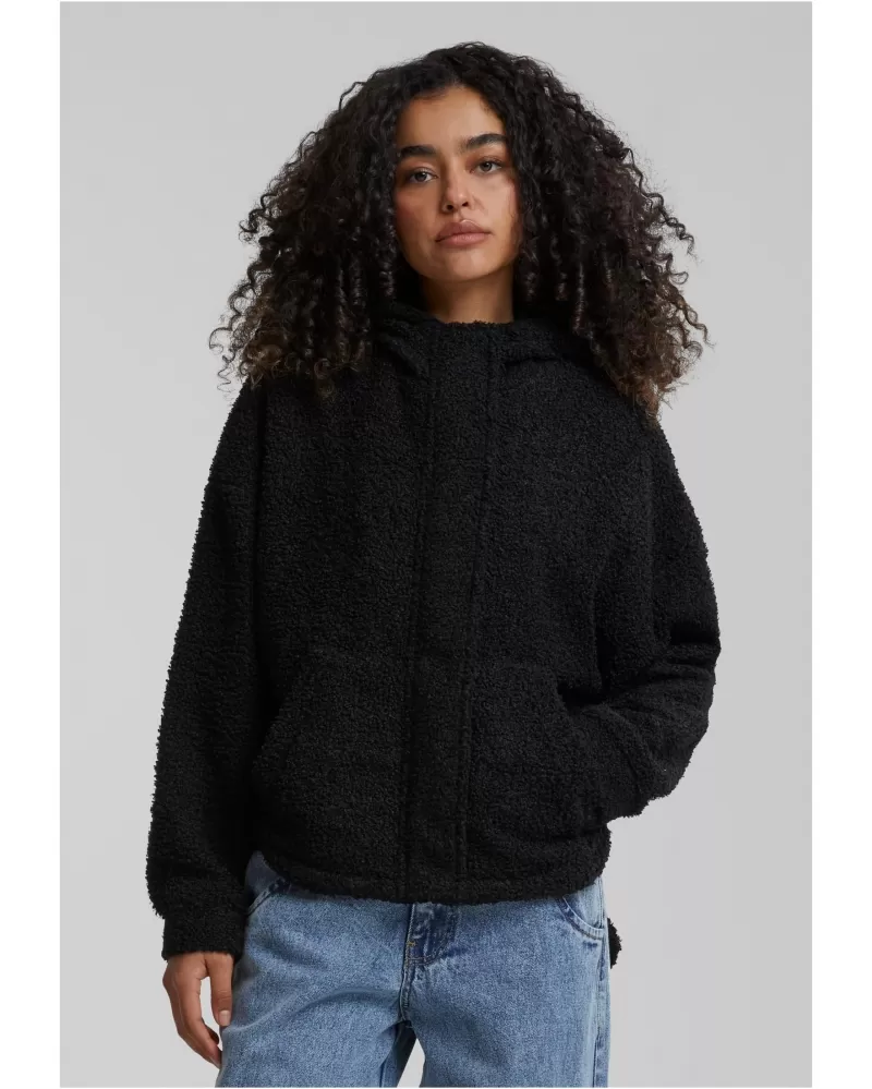 nadýchanou látkou Sherpa, navíc s kapucí a klokaní kapsou je tato dámská bunda zároveň extrémně útulným a elegantním společníkem. Jemné detaily se projevují v podobě širokých rukávů a zaobleného spodního lemu, který vzadu spadá hlouběji. Dámská bunda se zapíná na klopový zip. Pro zaokrouhlení byla přidána patentka na klopě a lemu. Zvolený materiál je polyester, střih volného střihu.