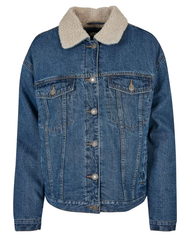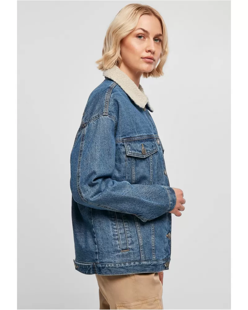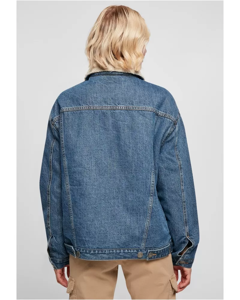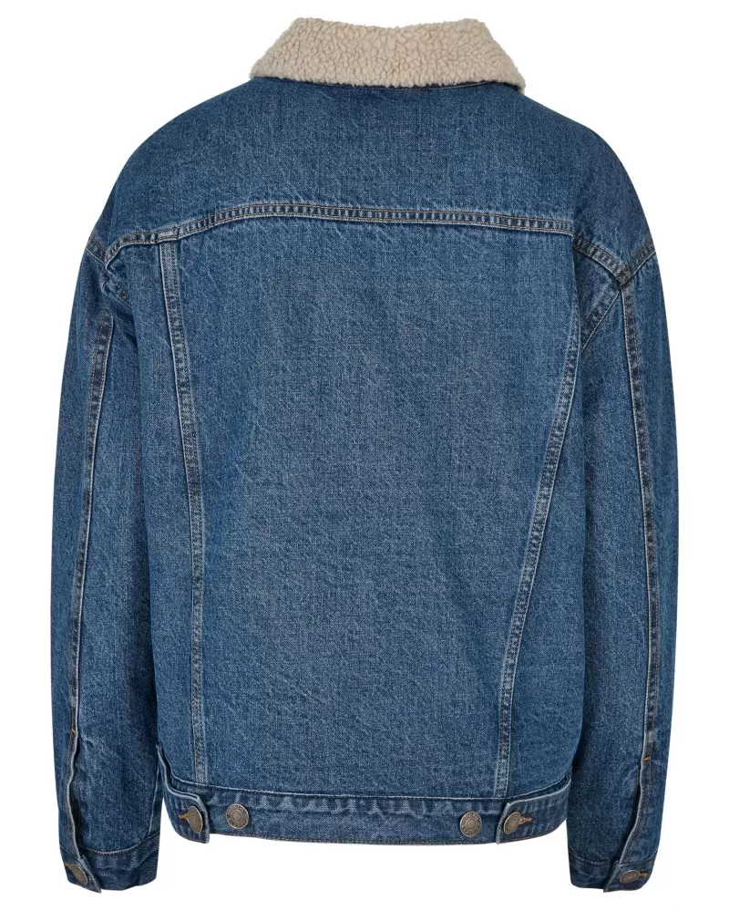 Džínová bunda pro ženy je vyrobena v klasickém oversized formátu a s límcem Sherpa a příjemnou podšívkou Sherpa. Typické prvky džínové bundy – knoflíková léga, náprsní kapsy s klopami kapes, boční kapsy i knoflíky a poutka na lemu – harmonicky definují vzhled. Dámská džínová bunda je vyrobena z bavlny a polyesteru.