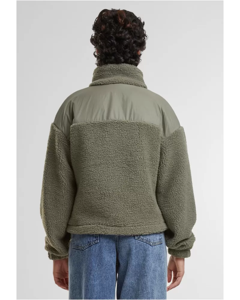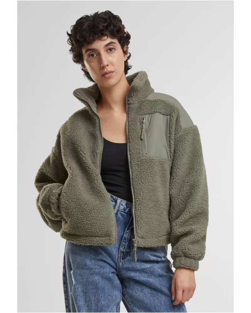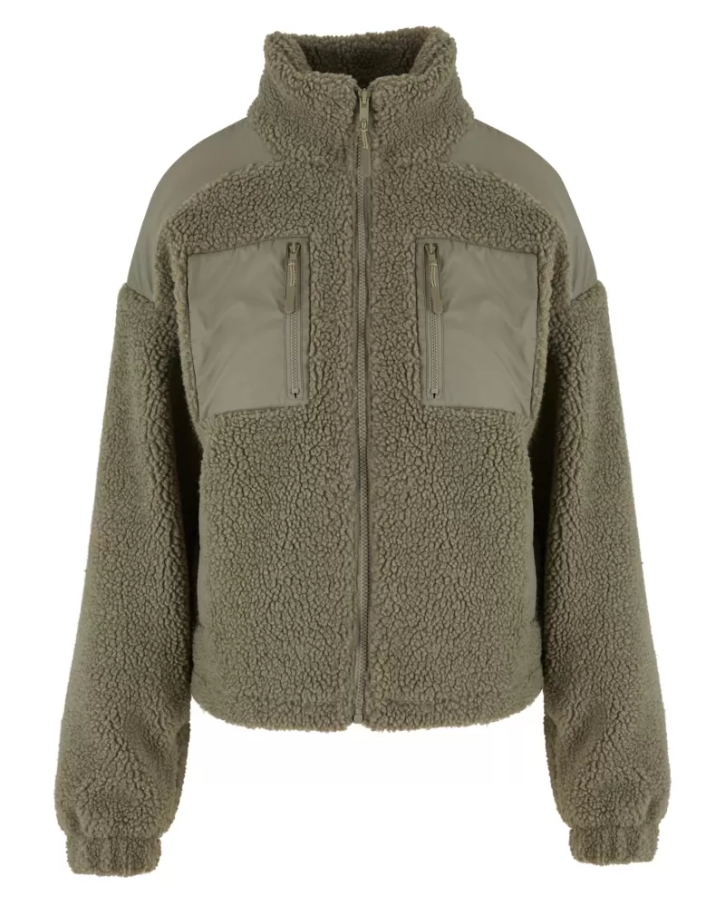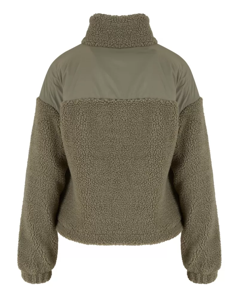 Lehká dámská bunda z nadýchané látky Sherpa dodává výrazné akcenty díky hladkým nylonovým vsadkám na ramenou a náprsní kapse. Má vysoký stojáček a zapíná se na zip. Další praktické detaily jsou boční kapsy, náprsní kapsa je navíc opatřena svislým zipem. Bunda Sherpa je oversize střihu s mírně spadlými rameny. Dá se upravit pomocí elastické šňůrky se zátkou na lemu. Elastické manžety rukávů poskytují dodatečnou podporu. Dámská bunda je podšitá síťovinou.