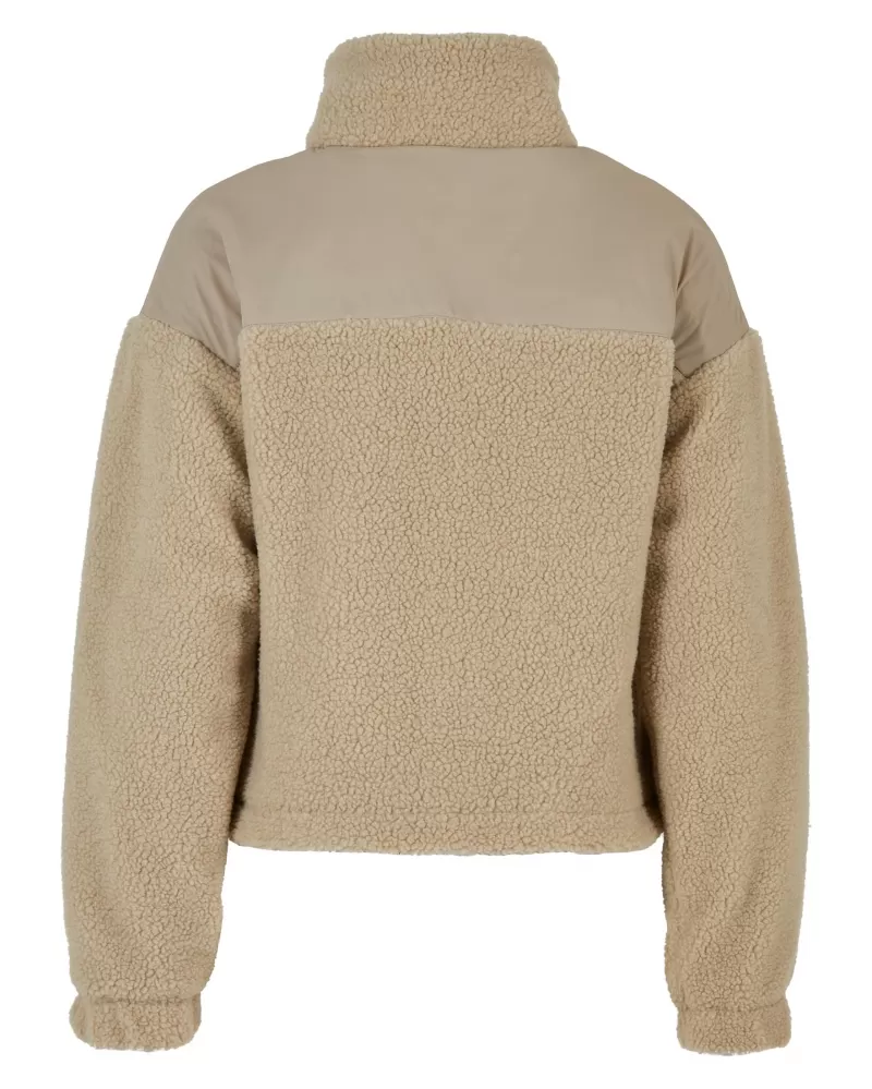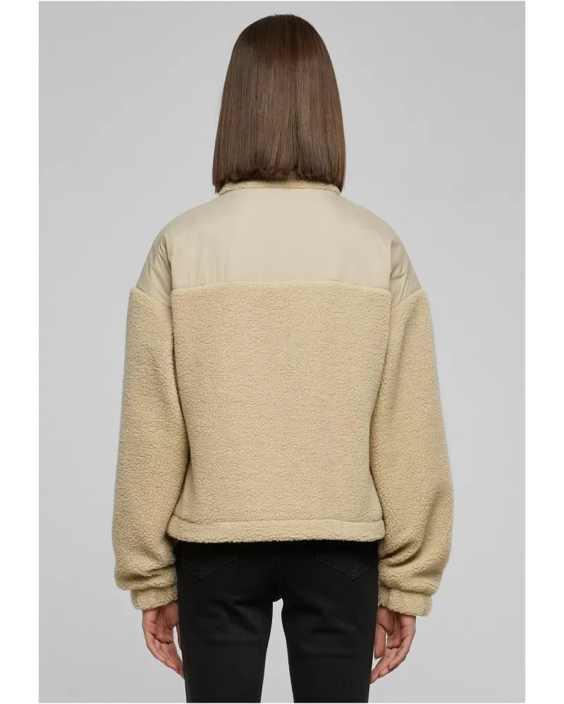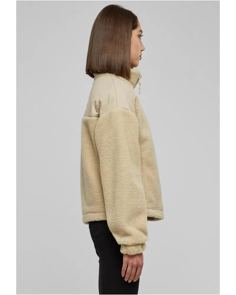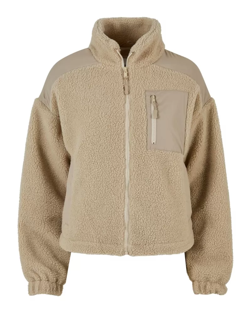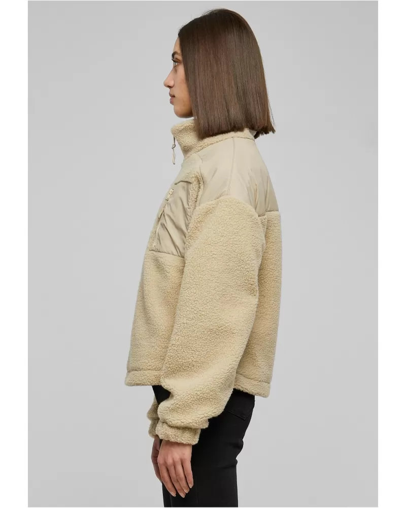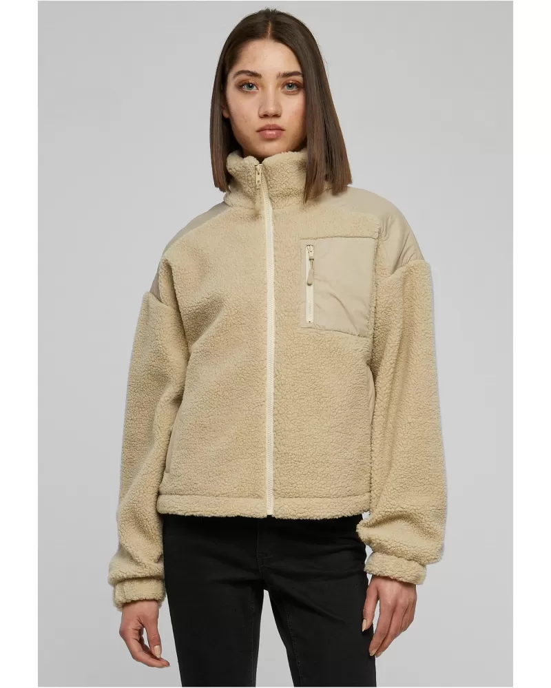 Lehká dámská bunda z nadýchané látky Sherpa dodává výrazné akcenty díky hladkým nylonovým vsadkám na ramenou a náprsní kapse. Má vysoký stojáček a zapíná se na zip. Další praktické detaily jsou boční kapsy, náprsní kapsa je navíc opatřena svislým zipem. Bunda Sherpa je oversize střihu s mírně spadlými rameny. Dá se upravit pomocí elastické šňůrky se zátkou na lemu. Elastické manžety rukávů poskytují dodatečnou podporu. Dámská bunda je podšitá síťovinou.