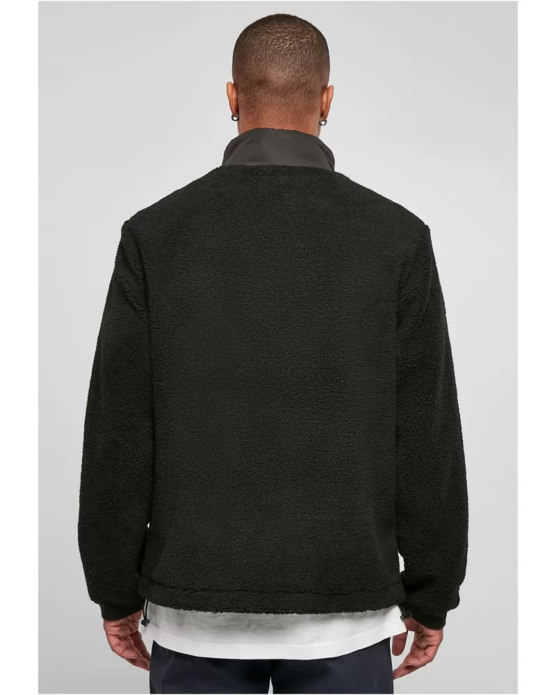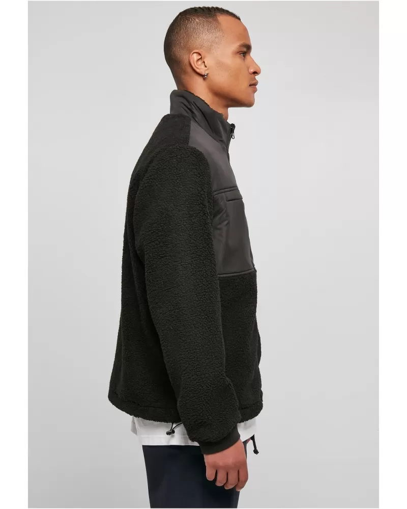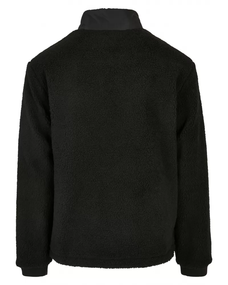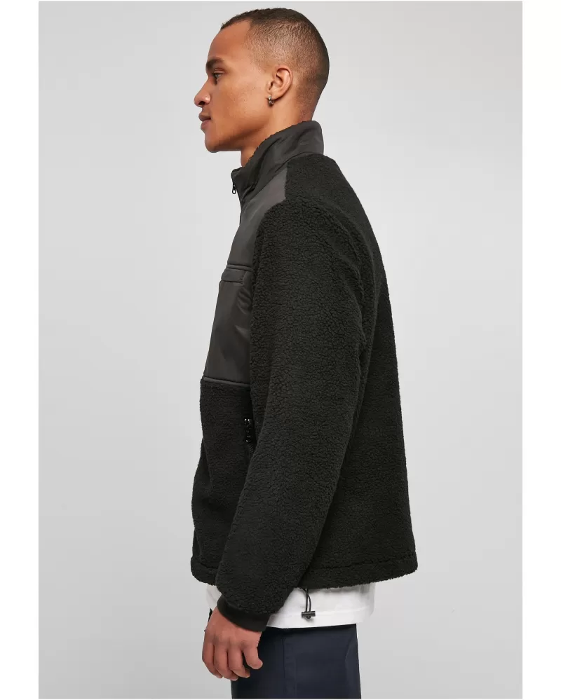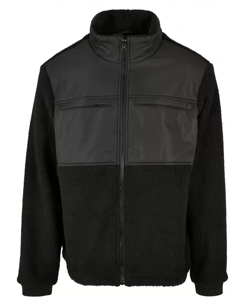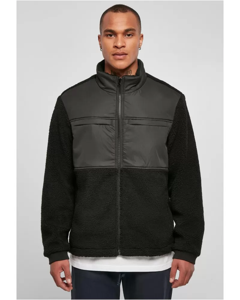 Módní pánská bunda se prezentuje vysoce kontrastní směsí látek. Tělo a rukávy jsou vyrobeny z nadýchané Sherpy, zatímco hrudník se leskne třpytivou polyesterovou tkaninou. Dvě náprsní kapsy se skrytými zipy vytvářejí harmonické akcenty a jsou doplněny dvěma bočními kapsami a pohodlnými žebrovanými manžetami. Bunda se zapíná na zip a má také stahovací šňůrku a zarážku na lemu pro větší přilnavost k tělu při nižších teplotách. Další pohodlí při nošení zajišťuje volný střih a příjemná podšívka charmeuse.
