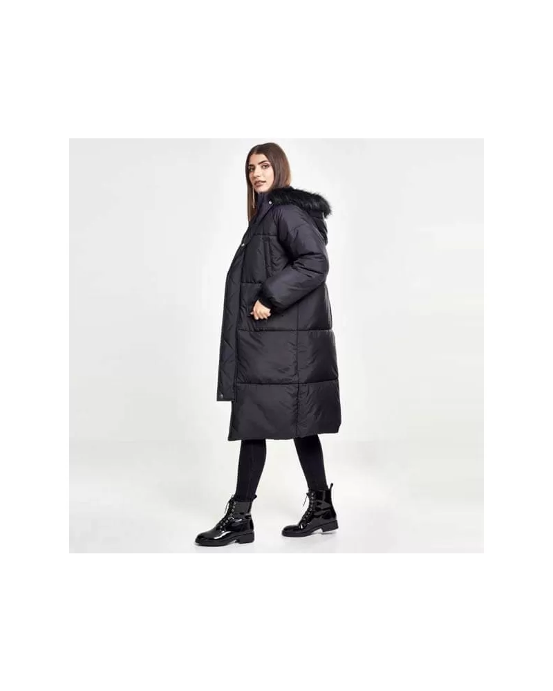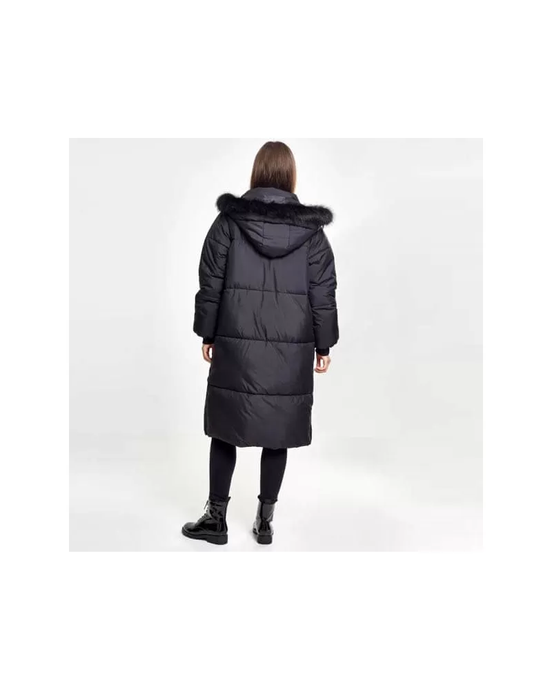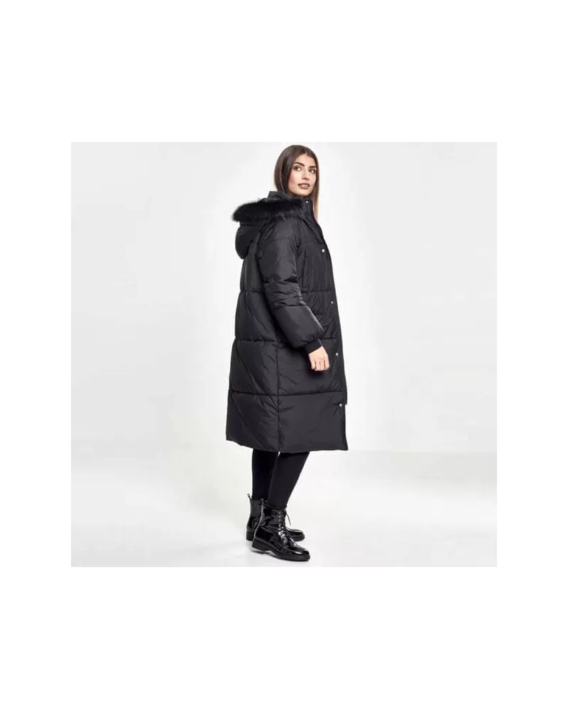 Tento hustě vycpaný kabát po kolena z lesklé látky vás dokonale zahřeje. Atraktivními prvky jsou raglánové rukávy, žebrované manžety a připojené boční kapsy s klopami. Velká kapuce je vybavena měkkou odepínatelnou umělou kožešinou.