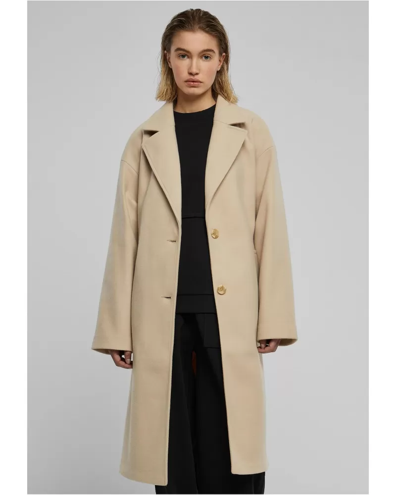 Tento jemný dámský kabát ke kolenům je reinterpretací dámské klasiky – s širokým klopovým límcem a dvěma knoflíky připomínajícími rohovinu. Ležérní oversize střih se spadlými rameny harmonicky doplňuje vzhled. Dále je kabát vybaven postranními kapsami a je vyroben z polyesteru a obsahuje příjemnou taftovou podšívku.