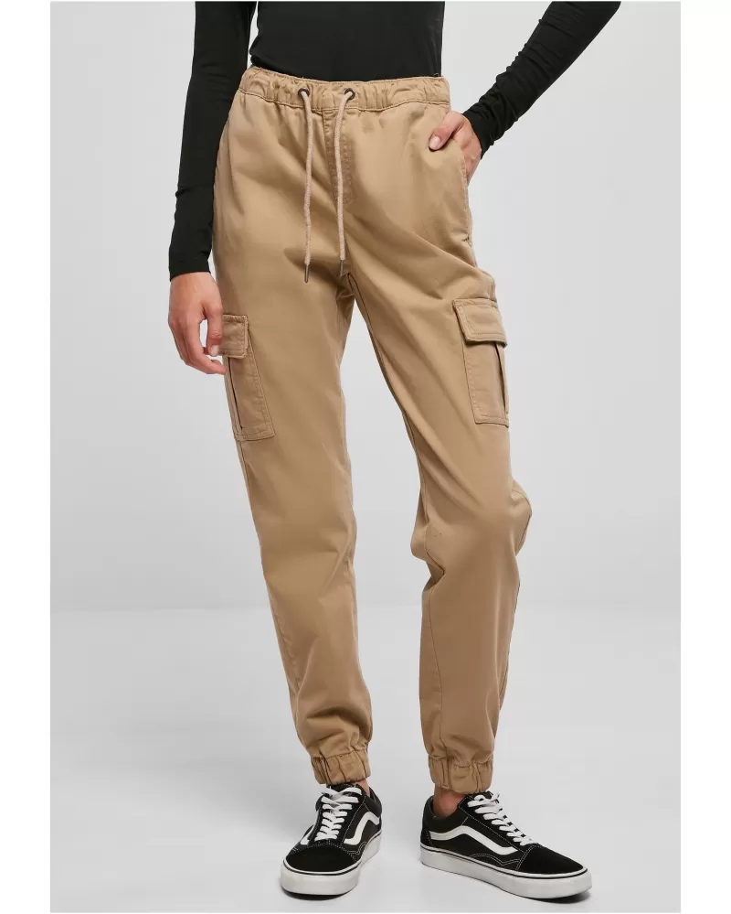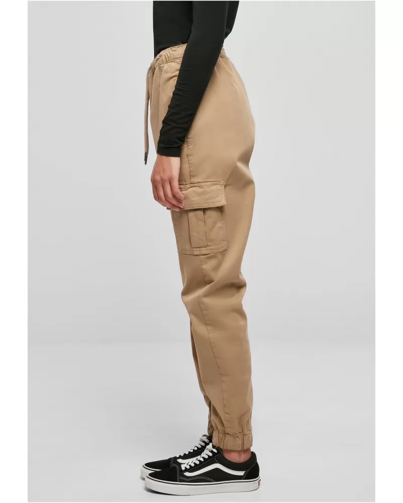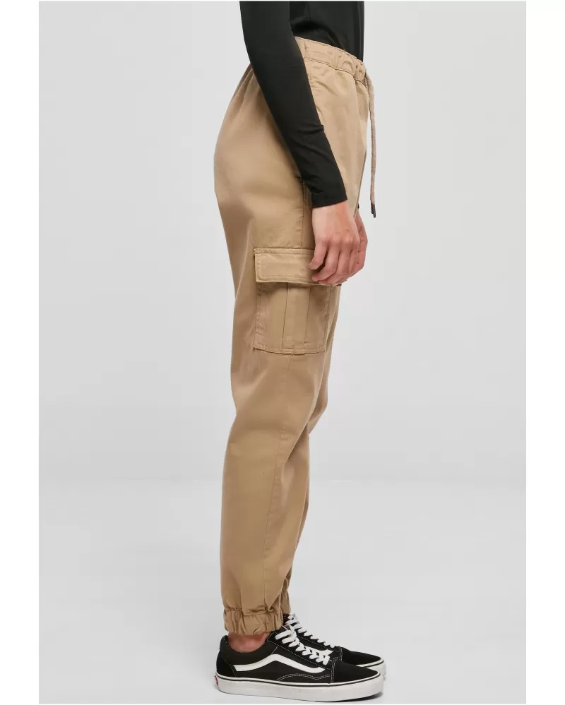 Pružné dámské cargo kalhoty kombinují sebevědomý styl s dokonalým komfortem nošení. Neobvyklé joggingové kalhoty jsou vyrobeny z pohodlného strečového kepru a sedí v pravidelném střihu vysoko v pase. Pas se nastavuje pomocí šňůrek s kvalitními kovovými špičkami a manžety jsou elastické. Styl definují dvě cargo kapsy na stehnech a zakončené dvěma praktickými bočními kapsami.