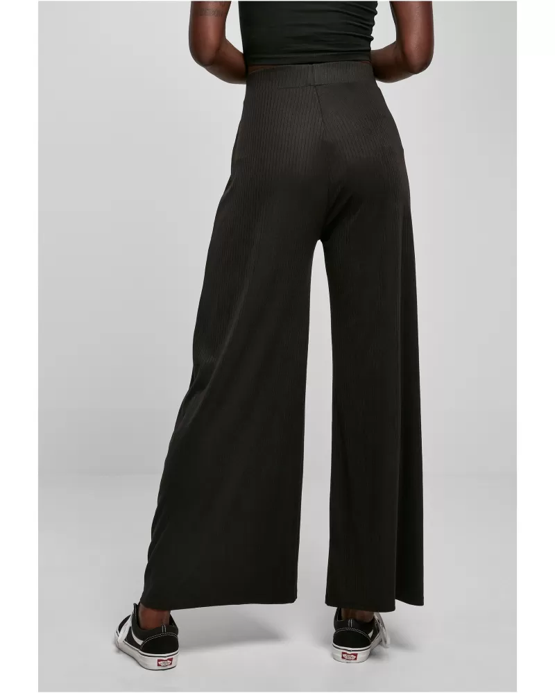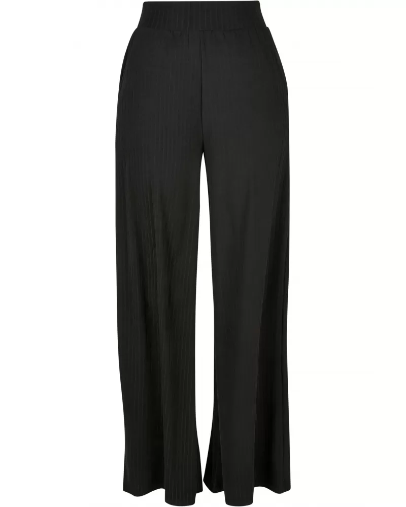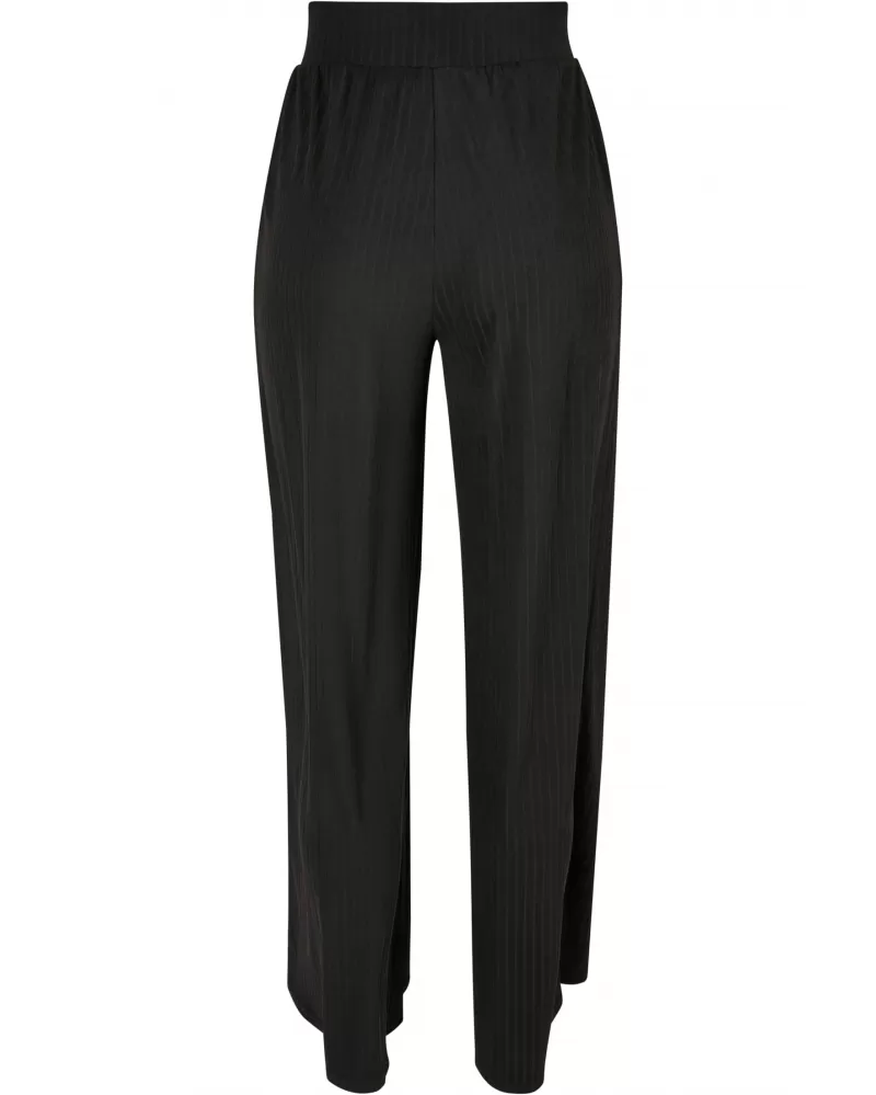 Dámské kalhoty širokého střihu potěší rovnou splývavou nohavicí a širokou žebrovanou tkaninou z elastického polyesteru a elastanu. Pohodlí při nošení zajišťuje široký elastický pas a je zakončen praktickými bočními kapsami. Kalhoty jsou regular fit.