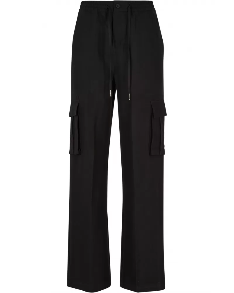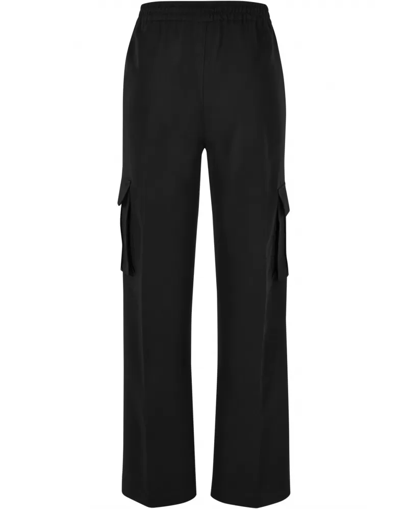 Dámské kalhoty spojují trendy vzhled do chytrého hybridu. Vyznačují se elastickým pasem se stahovacími šňůrkami a širokými a rovně střiženými nohavicemi, které jsou vybaveny klasickými balónovými kapsami s klopami. Design doplňují dvě boční kapsy. Hladký a splývavý materiál z viskózy a polyesteru a pohodlný volný střih odpovídá vzhledu.