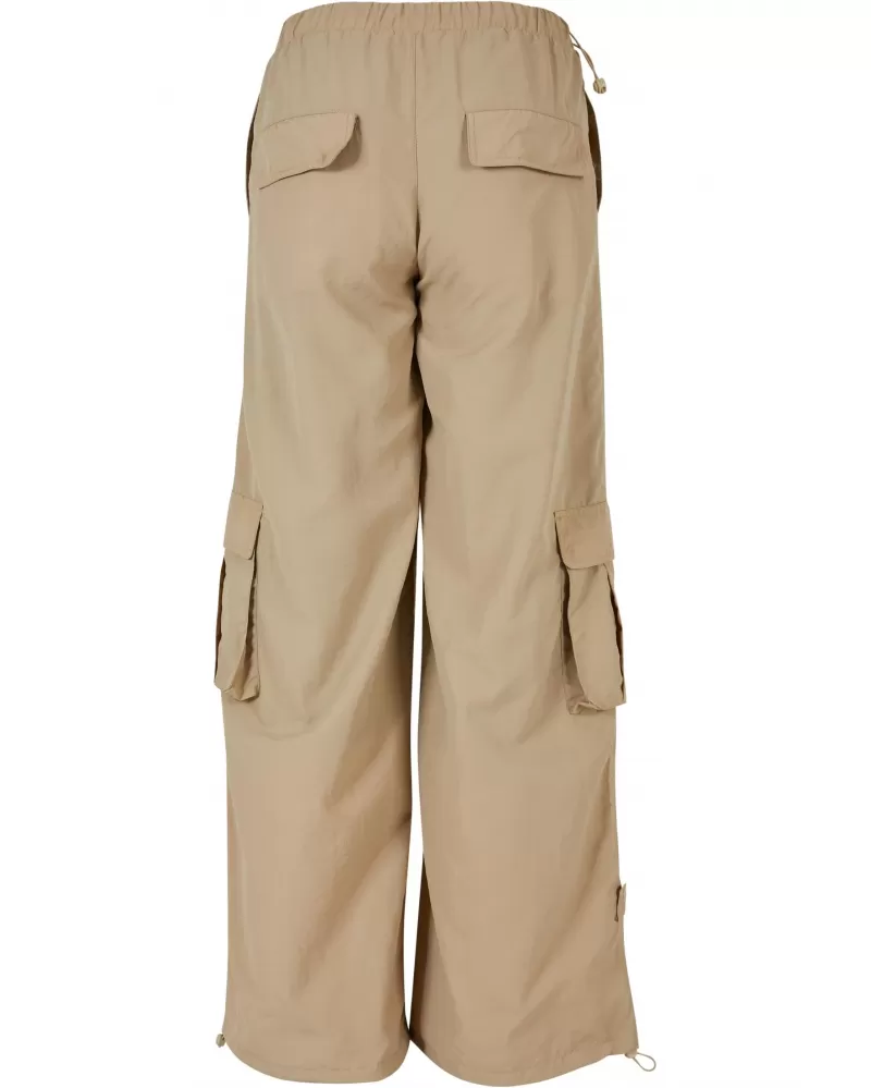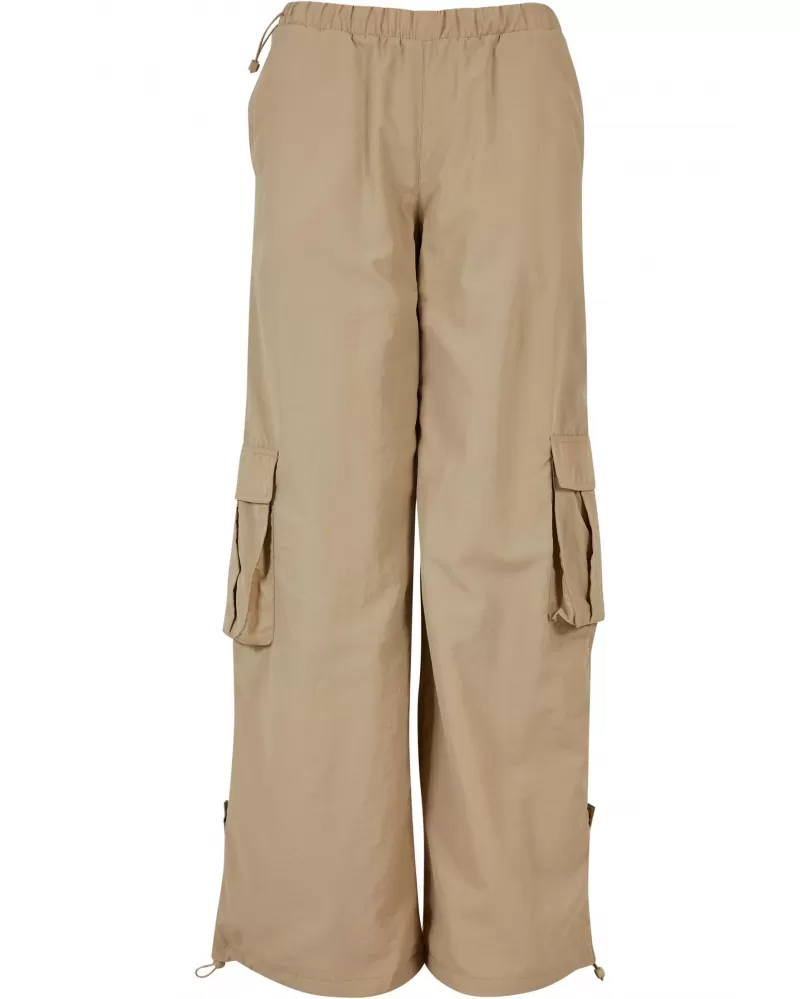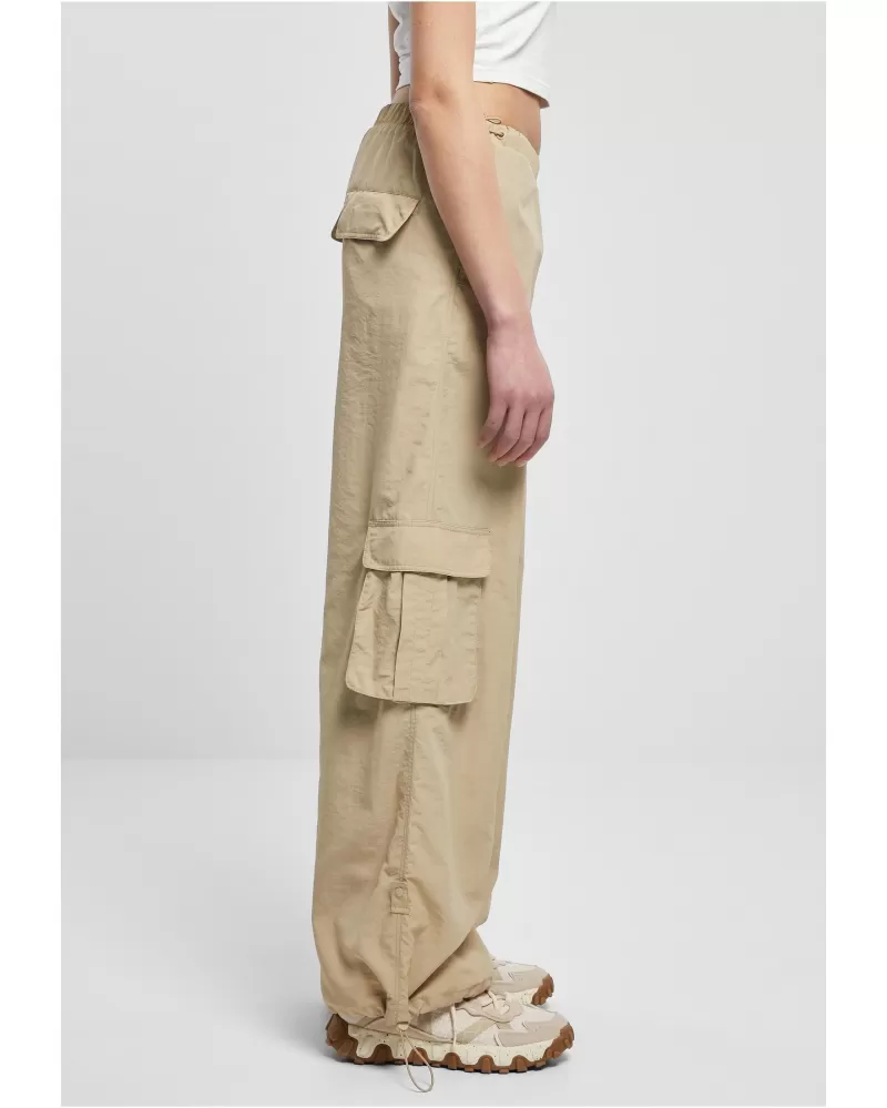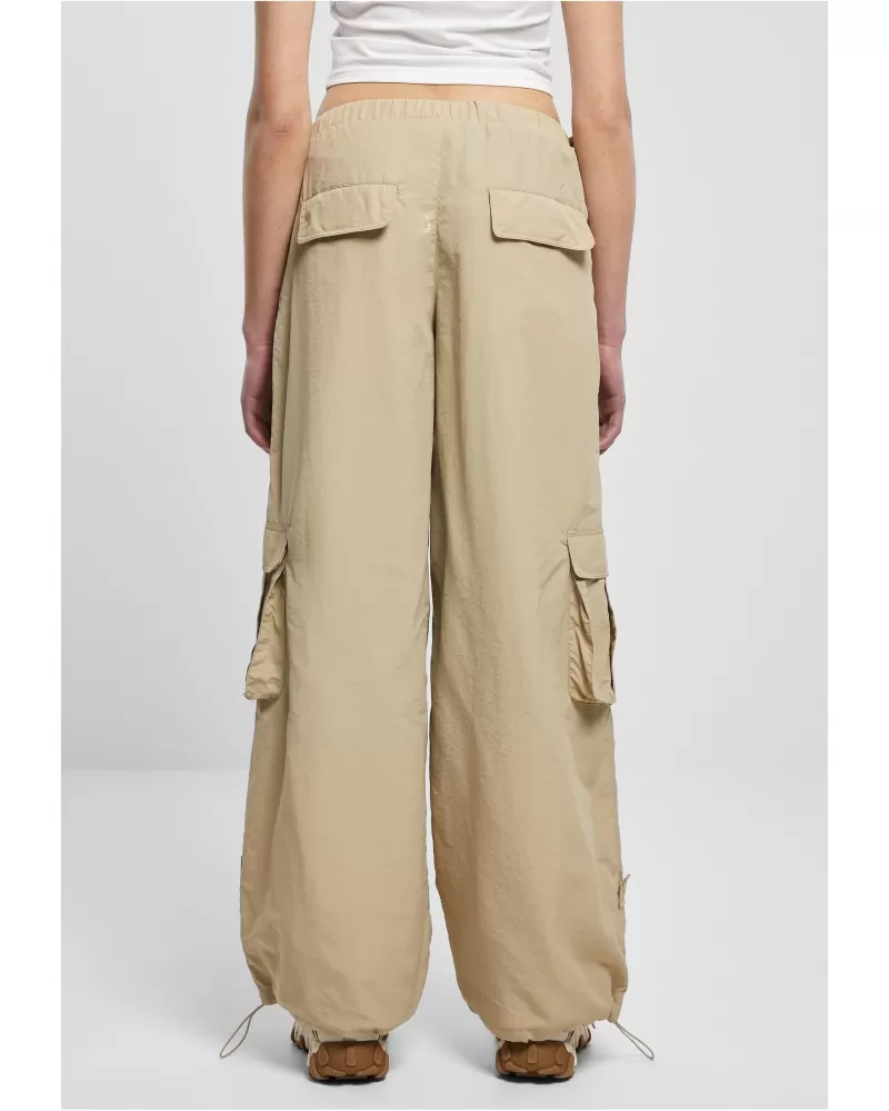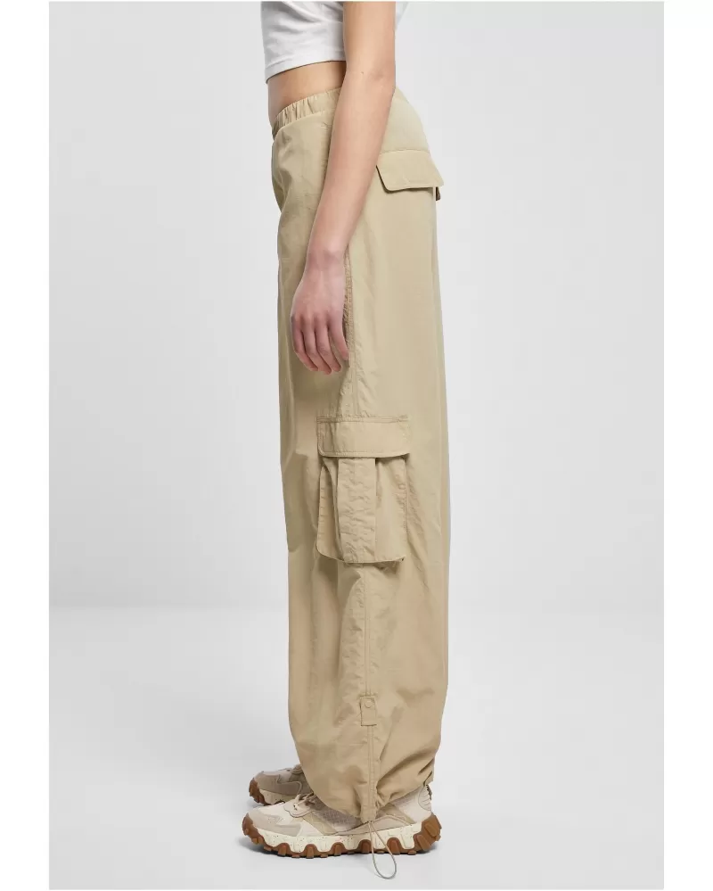 Široké a pohodlné kalhoty pro ženy kombinují balonové kalhoty s cargo stylem. Dodávají se s elastickým pasem se stahovacími šňůrkami a zarážkami, který sedí těsně nad boky. Elastické manžety jsou také opatřeny zarážkami, které vytvářejí široký tvar nabíraných kalhot. Úložný prostor se projevuje ve formě dvou bočních kapes a dvou zadních kapes s klopami – další cargo kapsy jsou umístěny ve výšce kolen. Materiál je vyroben z nylonové mačkané a střih je přirozeně volný.