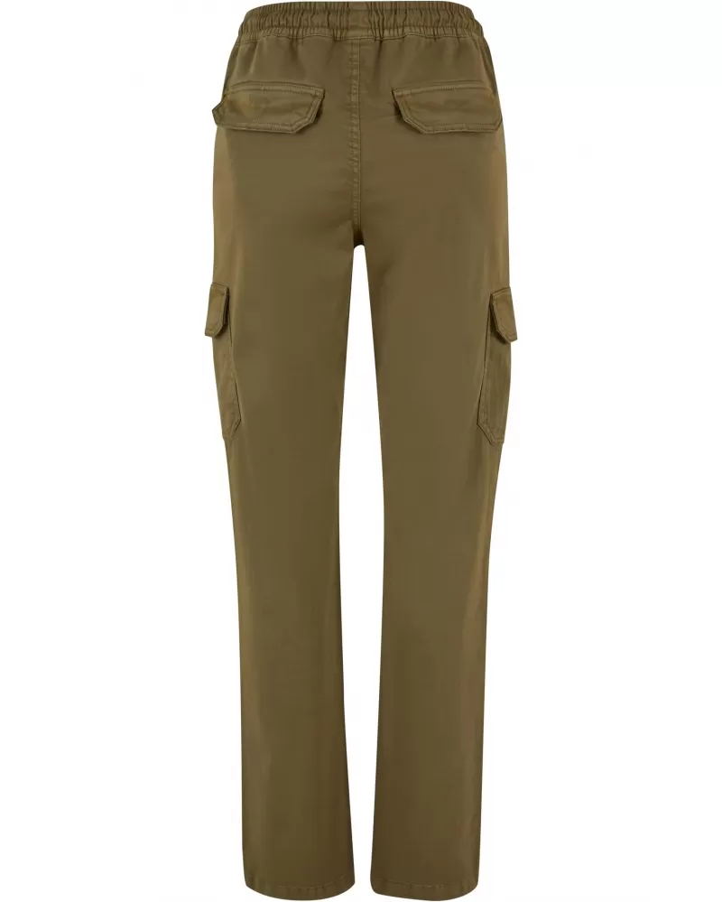 Dámské cargo kalhoty jsou inteligentním hybridem cargo kalhot a látkových kalhot. Mají celou řadu kapes: cargo kapsy, boční kapsy a dvě integrované kapsy s klopami na zadní straně. Kalhoty Cargo pohodlně sedí v pase a drží je na místě elastický pas se stahovacími šňůrkami. Poddajná, mírně pružná bavlněná tkanina vyrobená ze strečového kepru a pravidelný střih završují design.