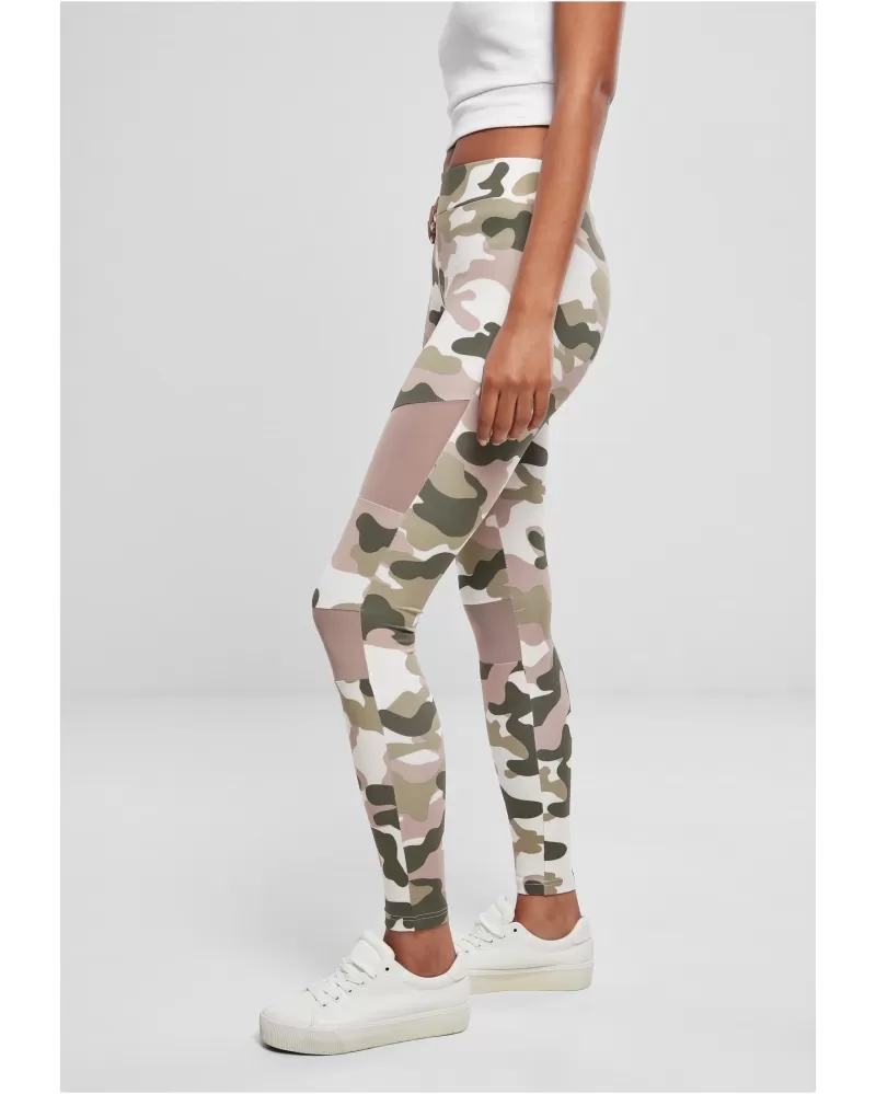 Dámské legíny URBAN CLASSICS TB1939 nabízejí neobvyklý styl a hladký střih. Technologické legíny pro sebevědomé dámy vykazují pevný celoplošný camo vzor. Vzhled ještě umocňují propracované síťované vsadky na úrovni stehen a kolen. Legíny přirozeně díky použitému strečovému materiálu přilnou k nohám. Maximální pohodlí při nošení zajišťuje vysoký a široký elastický pas. Vhodné na sportování, volný čas, příroda. Složení materiálu 77% polyester, 23% elastan.