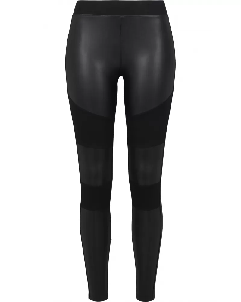 Dámské legíny URBAN CLASSICS TB3246. Přední část zdobí žerzejové vsadky, které sedí uprostřed stehen a kolen. Legíny jsou vyrobeny z umělé kůže, střih perfektně obepíná postavu. Materiál je pohodlný, hladký, pas je elastický. Údržba: jemné praní 30°C, nesušit v sušičce, nežehlit. Legíny jsou vhodné na běžné nošení, na procházky, do práce, do města. Složení materiálu: 1 materiál: 91% polyester, 9% elastan, 2 materiál: 65% viskóza, 30% nylon, 5% elastan.