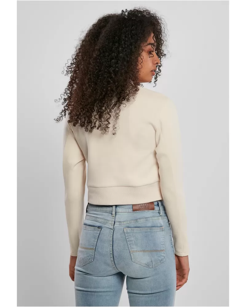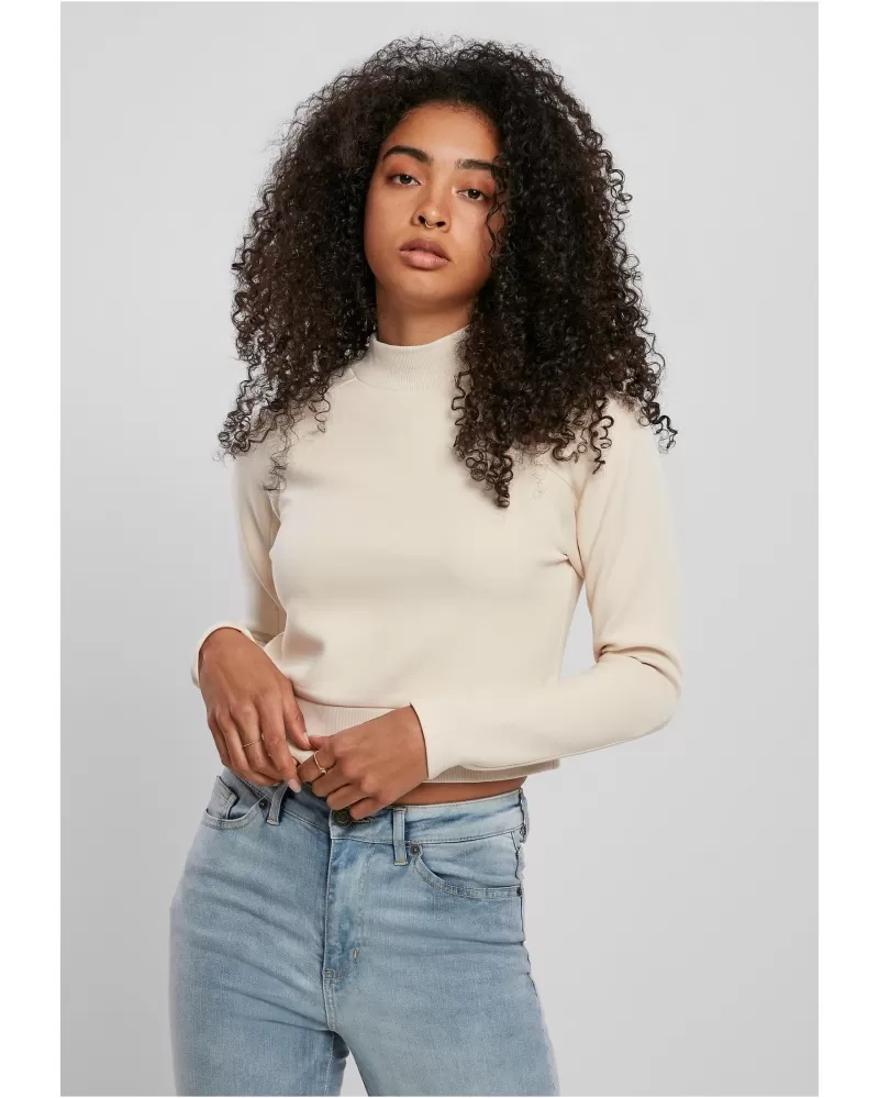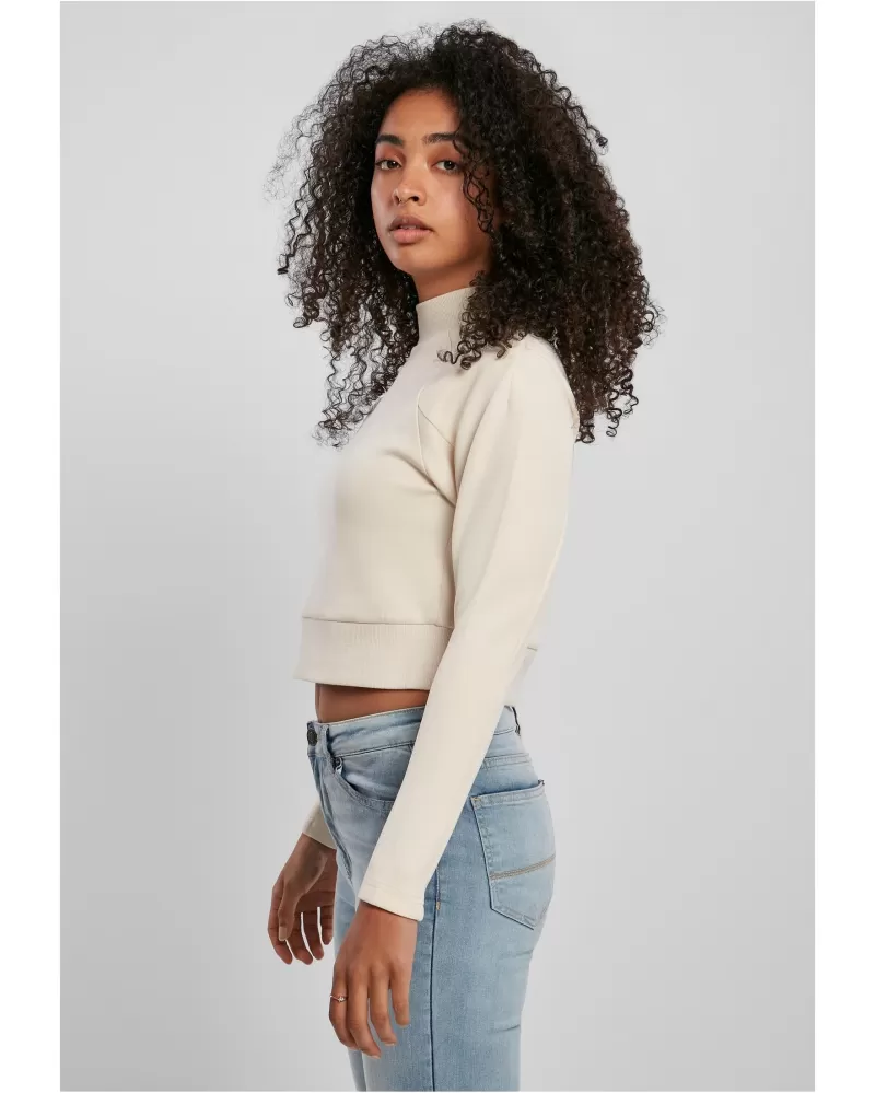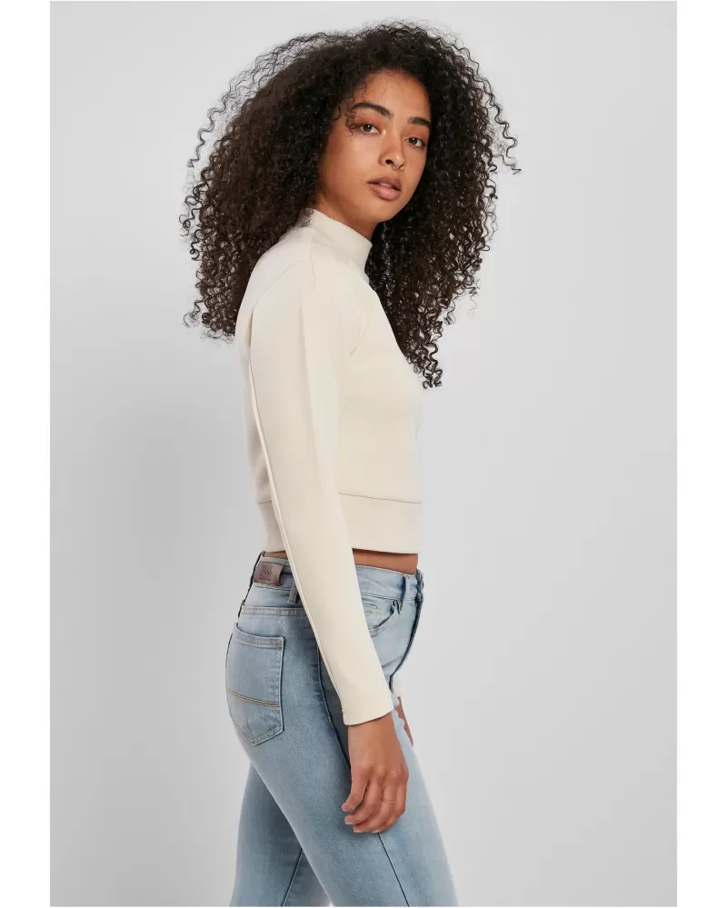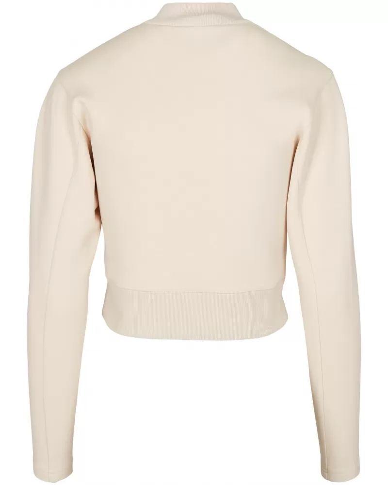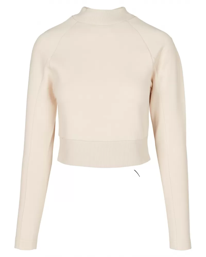 Moderní a elegantní dámský svetr pro fashionisty. Střih je krátký, ale nabízí velkou a dominantní šířku s velkou volností pohybu kolem ramen díky raglánovému tvaru. Stojáček je vyroben z žebrované tkaniny. Široký, zdůrazněný lem dodává mikině styl, zatímco interlockový materiál poskytuje jistý postoj. Střih je pravidelný. Sportovní a elegantní zugleich.