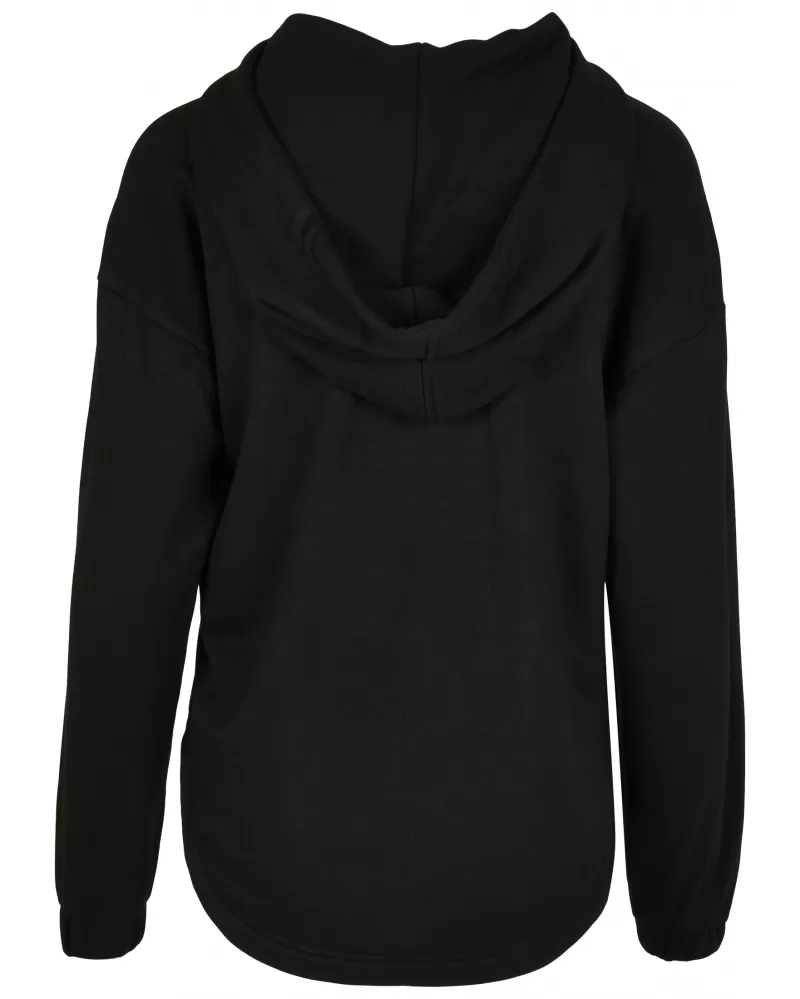 Útulná dámská mikina s kapucí pro tisíce hodin pohody. Materiál je poddajné modal froté a střih je pohodlného volného střihu. Prodloužený zadní díl dodává svetru další módní nálev. Mikinu doplňují elastické žebrované manžety.
