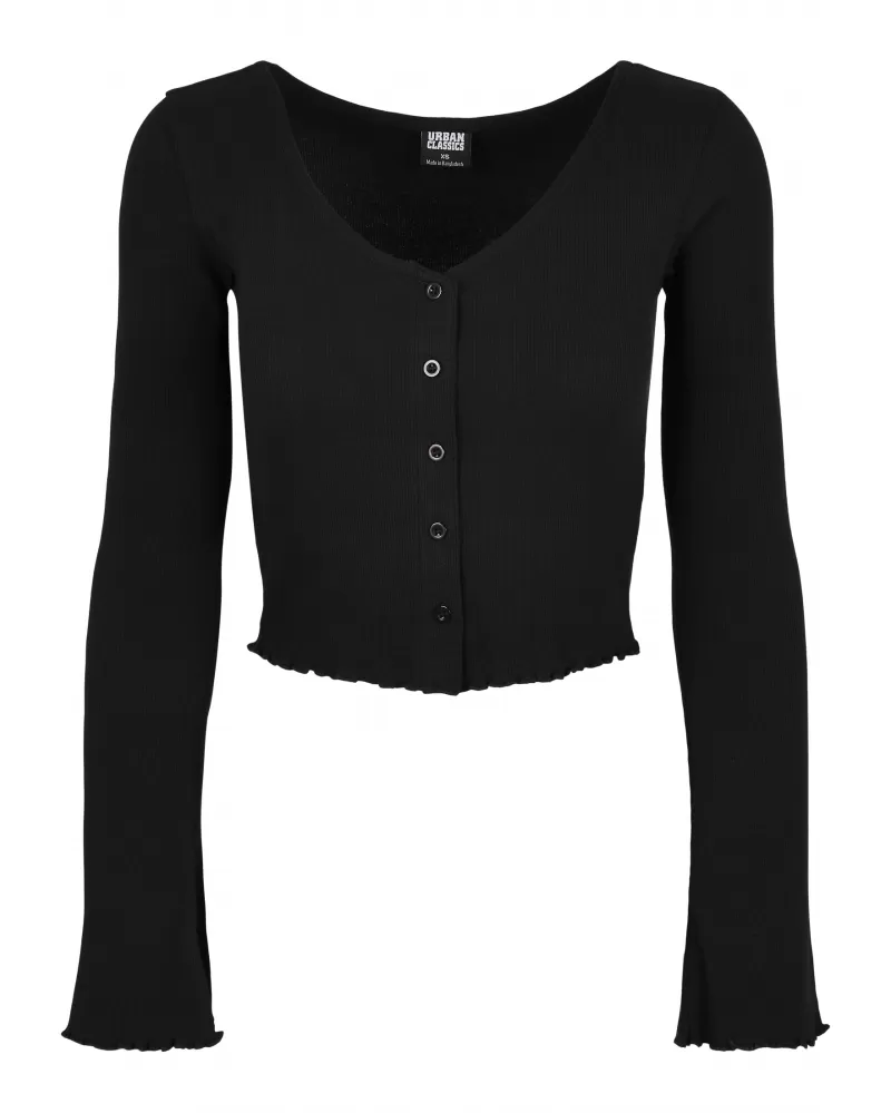 Tento sexy a ženský kardigan pro ženy se prezentuje rafinovanými detaily. Střih je krátký a zkrácený a nabízí ladící výstřih do V a barevně sladěnou knoflíkovou légu. Dlouhé rukávy dámského kardiganu jsou mírně rozšířené. Všechny lemy jsou hravě rolované. Letní módní high flyer má úzký střih a je vyroben z pohodlného strečového žebrování.