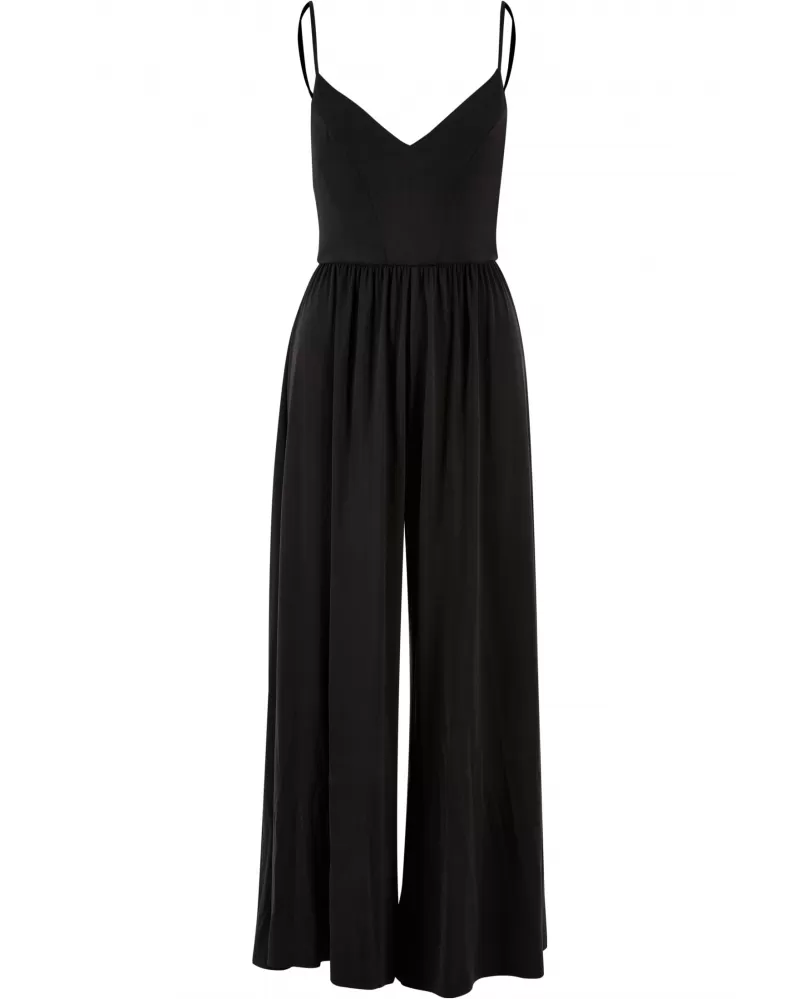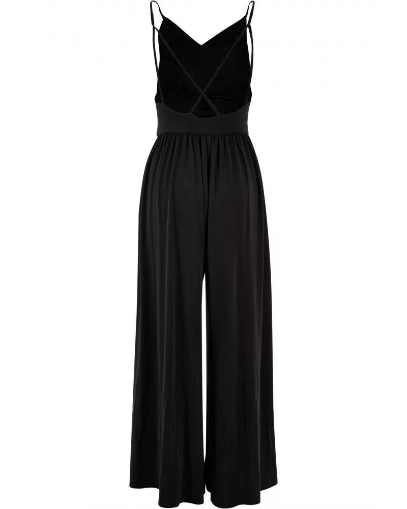 Dámská kombinéza je vysoce kontrastní módní kousek na léto. Horní část nabízí výstřih do V a nastavitelná špagetová ramínka. Vzhled bez zad se zkříženými ramínky a dělicími švy zaoblují živůtek a poskytují ideální padnutí. Dále po onesie ¾ střižené nohavice široce a v paralelních záhybech. Jednodílný oblek je vyroben z modalu a polyesteru a je volného střihu.