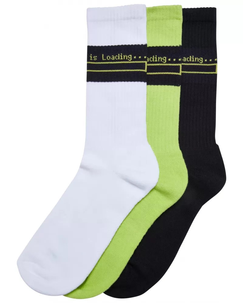 Tato trojitá sada obsahuje tři páry ponožek s moderním designem. Součástí hřídele je designový motiv "načítá se...". Vyobrazená nakládací lišta je na jedné straně prázdná a na druhé vyplněná, která je umístěna pod nápisem „Urban Classics“. Pro větší pohodlí při nošení je tkanina topůrka žebrovaná a má malou manžetu. Pokožce příjemný materiál ponožek tvoří bavlna, polyester a elastan. Jsou dostupné ve čtyřech velikostech.