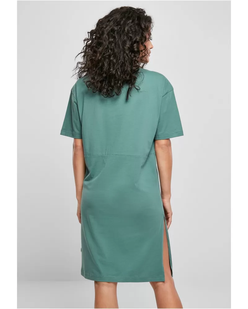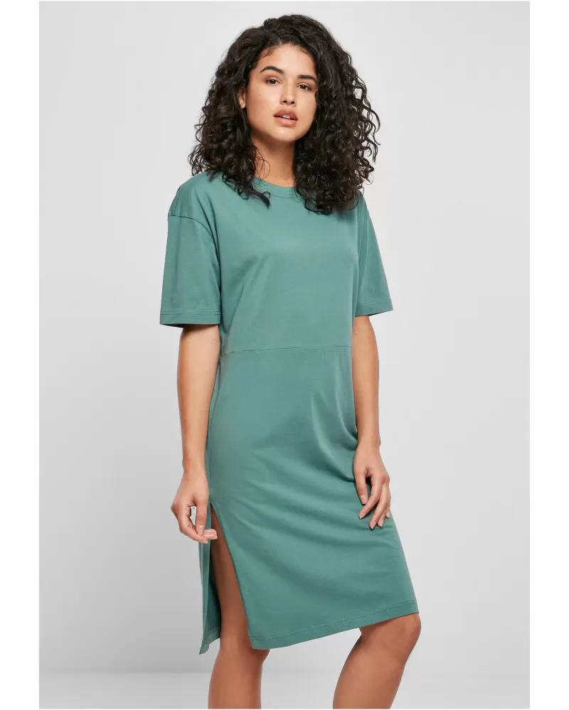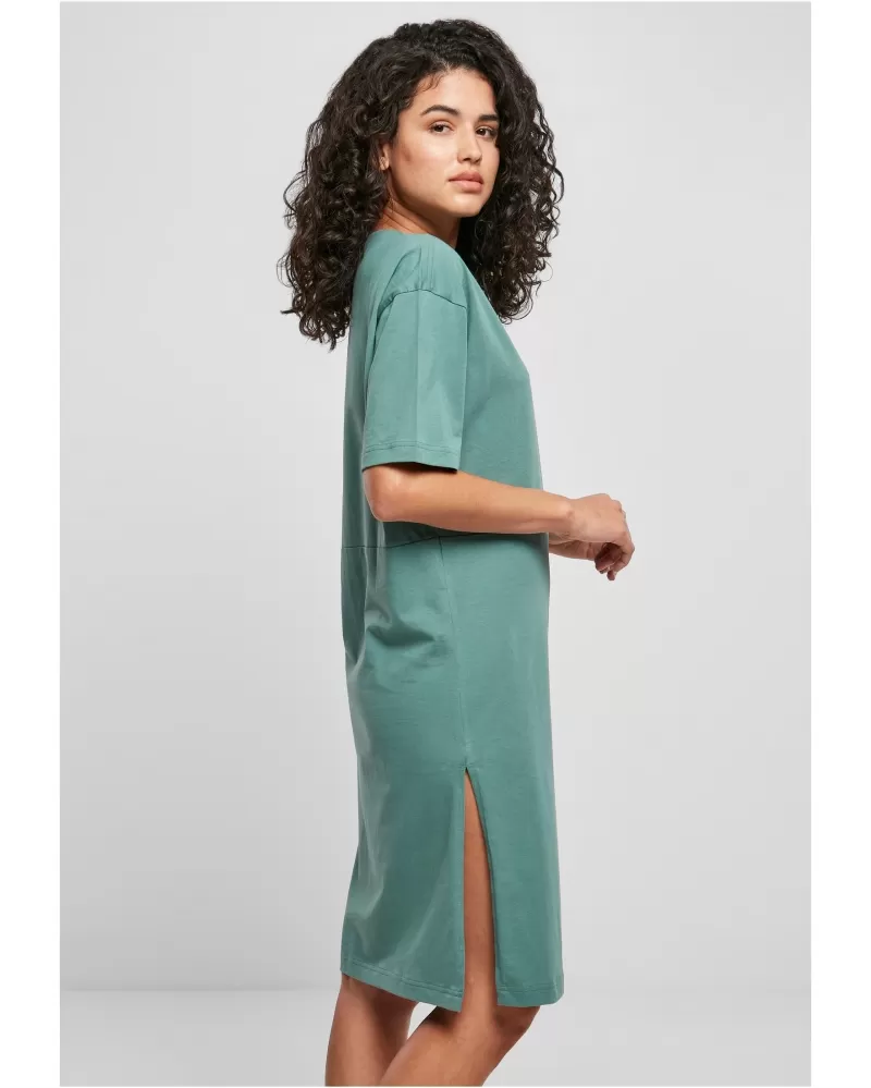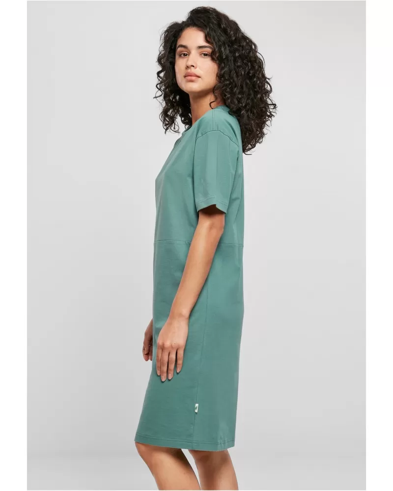 Tyto krásné dámské šaty ve stylu trička, vybavené dlouhými rozparky na obou stranách, upoutají pozornost. Rukávy jsou široké, šikmé a sahají téměř k loktům. Střih je ke kolenům, výstřih je kulatý. Dělící šev v pase zajišťuje dokonalý tvar a ladí s celkovým oversize střihem. Smyslné dámské šaty jsou vyrobeny z organické bavlny a jsou opatřeny štítkem s vlajkou na boku a doprovodným ekologickým štítkem.