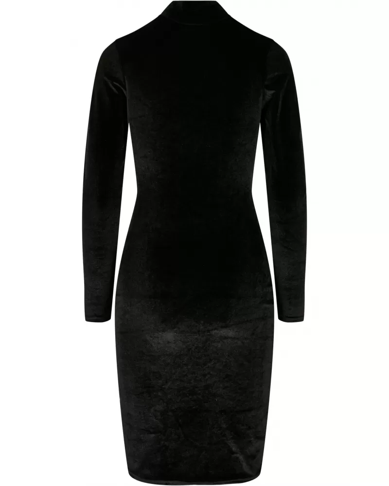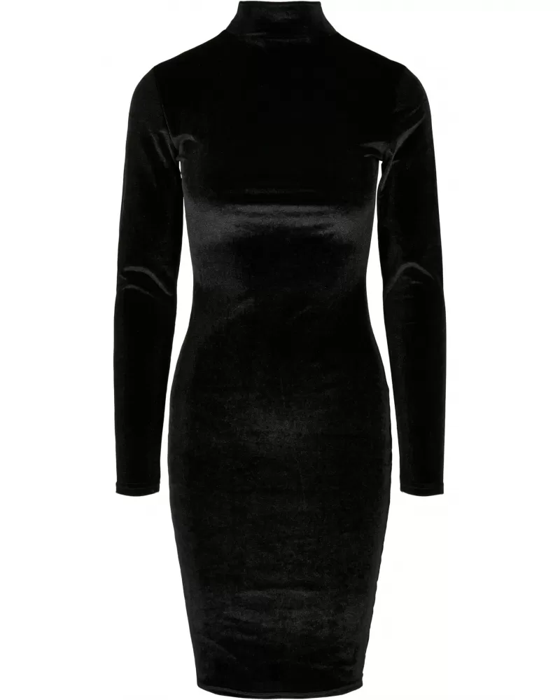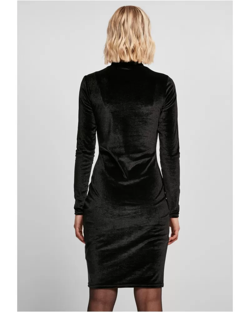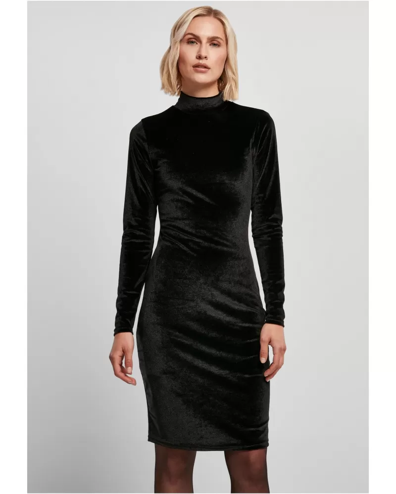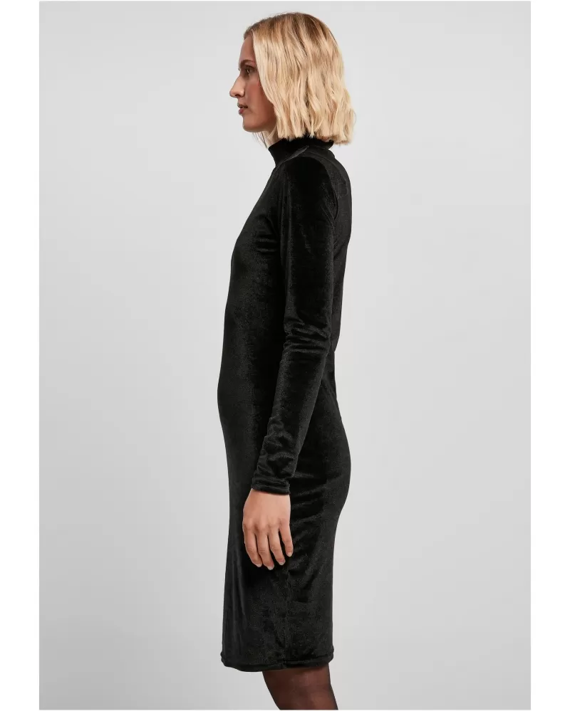 Vzhled těchto dámských šatů ženského střihu je definován jemnou, jemně třpytivou strečovou sametovou látkou a jasným tvarem. Navíc má rolák a dlouhé rukávy a končí na úrovni kolen. Střih je pohodlný a přiléhavý. Malé procento elastanu zajišťuje skvělé pohodlí při nošení