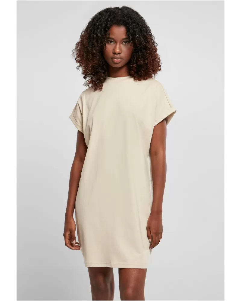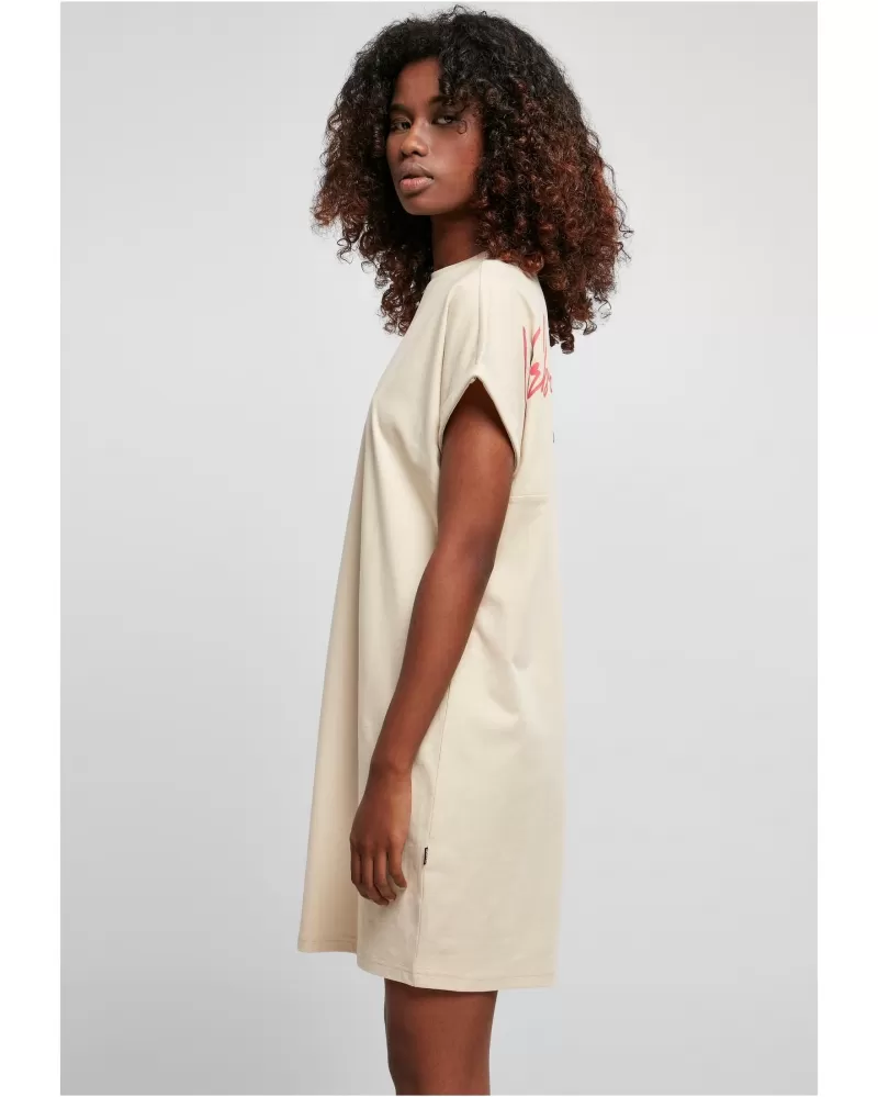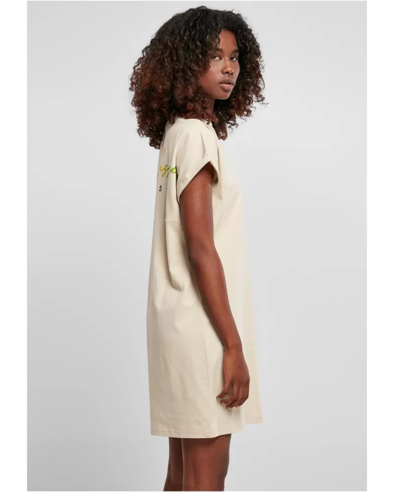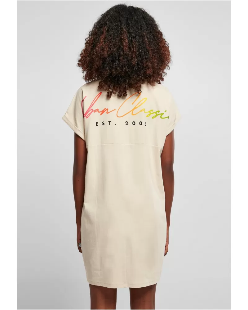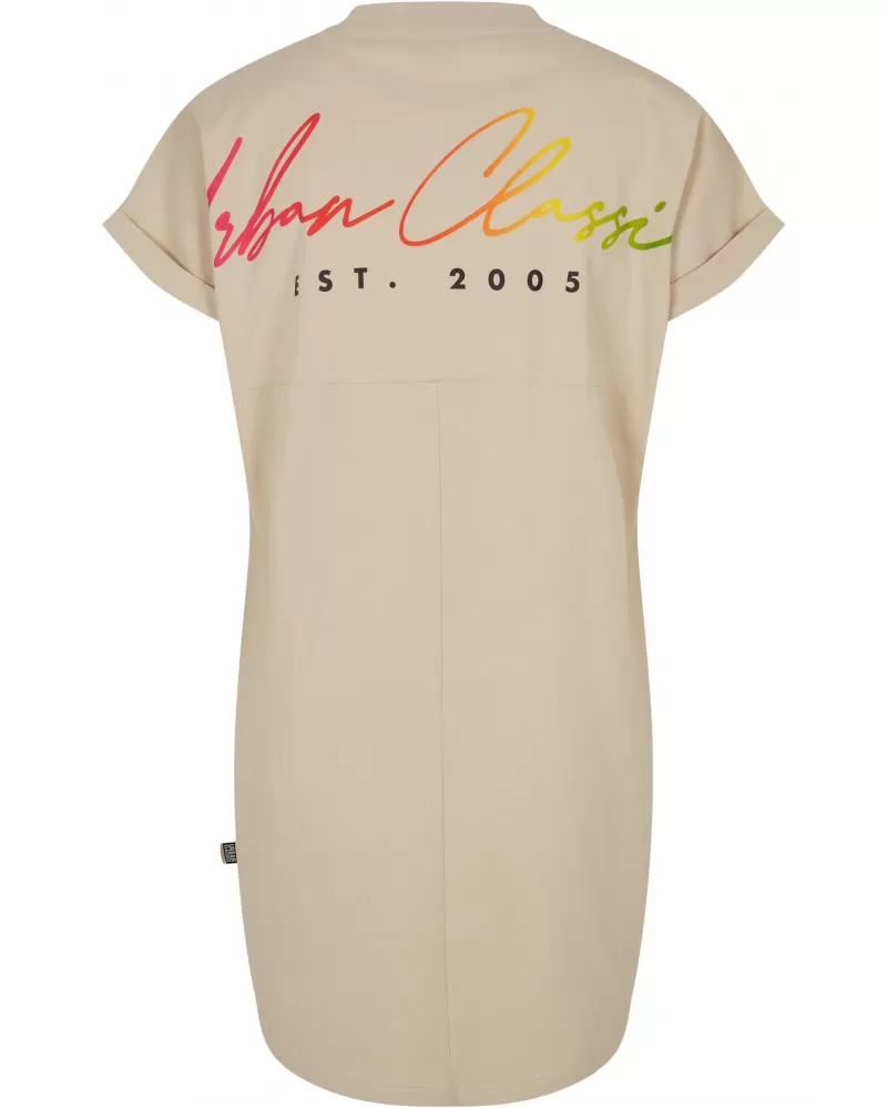 Atraktivní minišaty se svěžím letním vzhledem, chytrými detaily a neobvyklým znakem na zádech s logem Urban Classics přecházejícím přes ramena a s přechodovým vzhledem v duhových barvách. Látka šatů je bavlna šetrná k pokožce a má odpovídající barvu. Akcenty dodává pohodlný volný střih, mírně zvýšený žebrovaný výstřih a zkrácené krátké rukávy s manžetami. Díky sedlu vzadu je zajištěno optimální padnutí šatů.