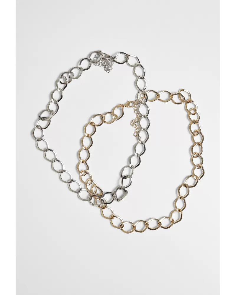 Tato sada šperků Urban Classics obsahuje dva základní náhrdelníky, které doplní různé pouliční outfity. Přesněji řečeno, skládá se ze dvou článkových náhrdelníků, jednoho zlaceného a jednoho stříbrného. Velké články řetízků umožňují spojitý vzhled nebo alternativně nosit náhrdelníky jako samostatné jednotlivé kusy. Šperk je vyroben ze železa.