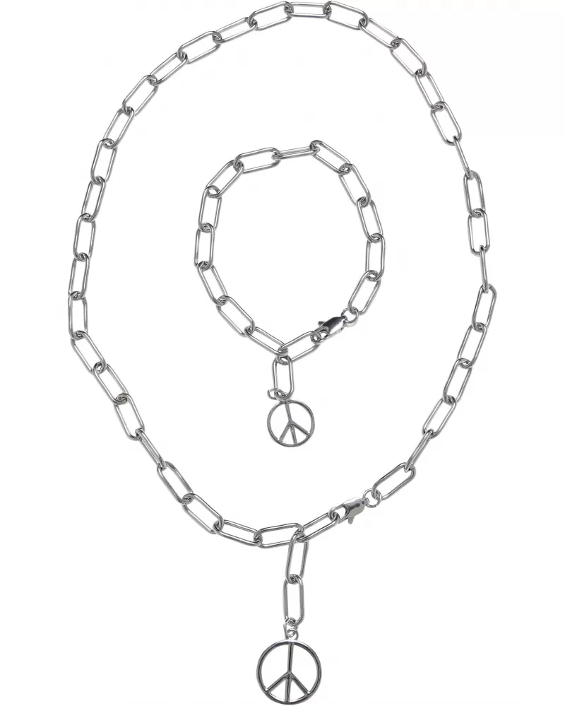 Každá část této harmonické sady náhrdelníku a náramku ukazuje moderní tvar Y a doprovodný přívěsek, který se vyznačuje symbolikou míru. Uzávěry jsou inovativní: malé karabiny, které lze zaháknout do jakéhokoli článku řetězu, což umožňuje individuální nastavení náhrdelníku a náramku. Ten je mimochodem dostupný ve dvou různých velikostech. Také design kotevního řetězu s dlouhými, velkými články řetězu je nadčasový. Módní sada šperků je vyrobena ze železa a zinku.