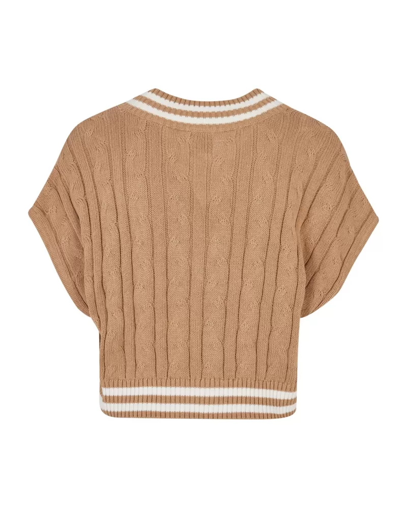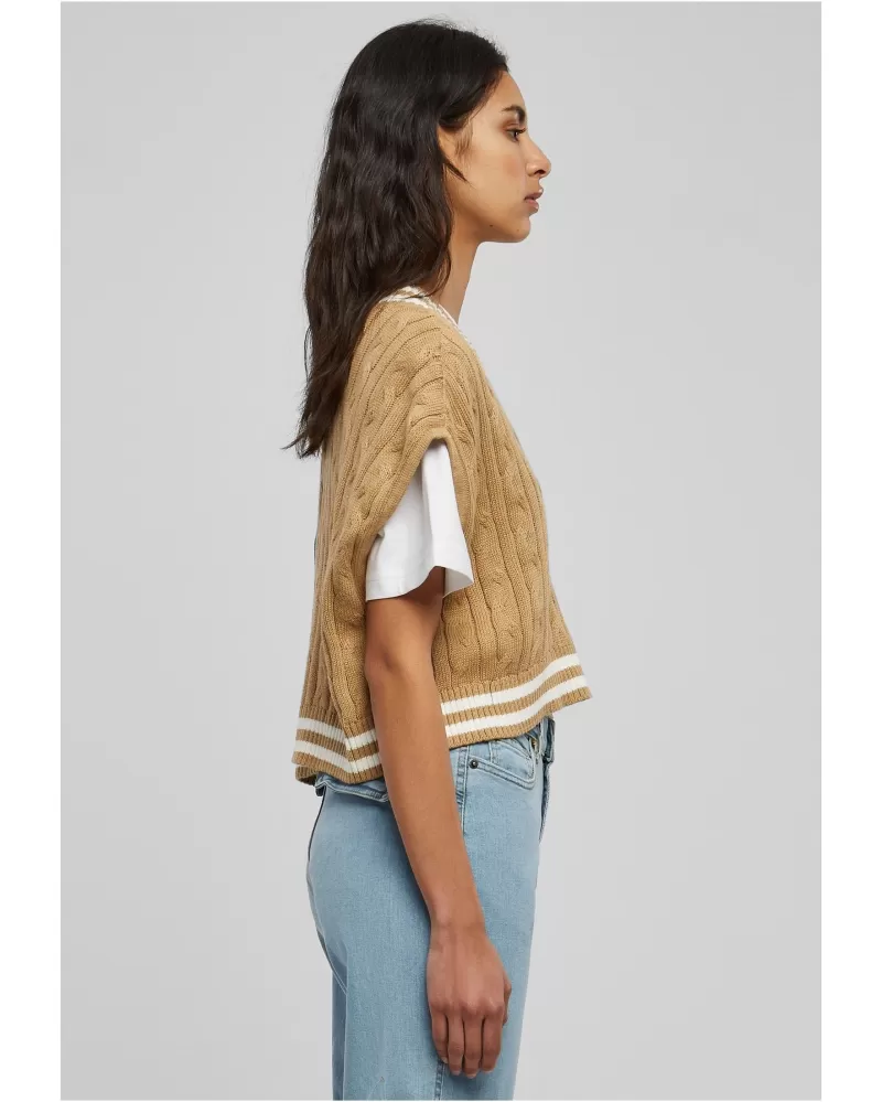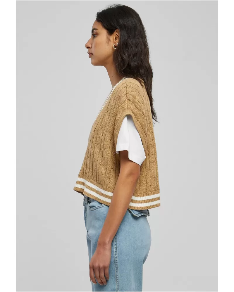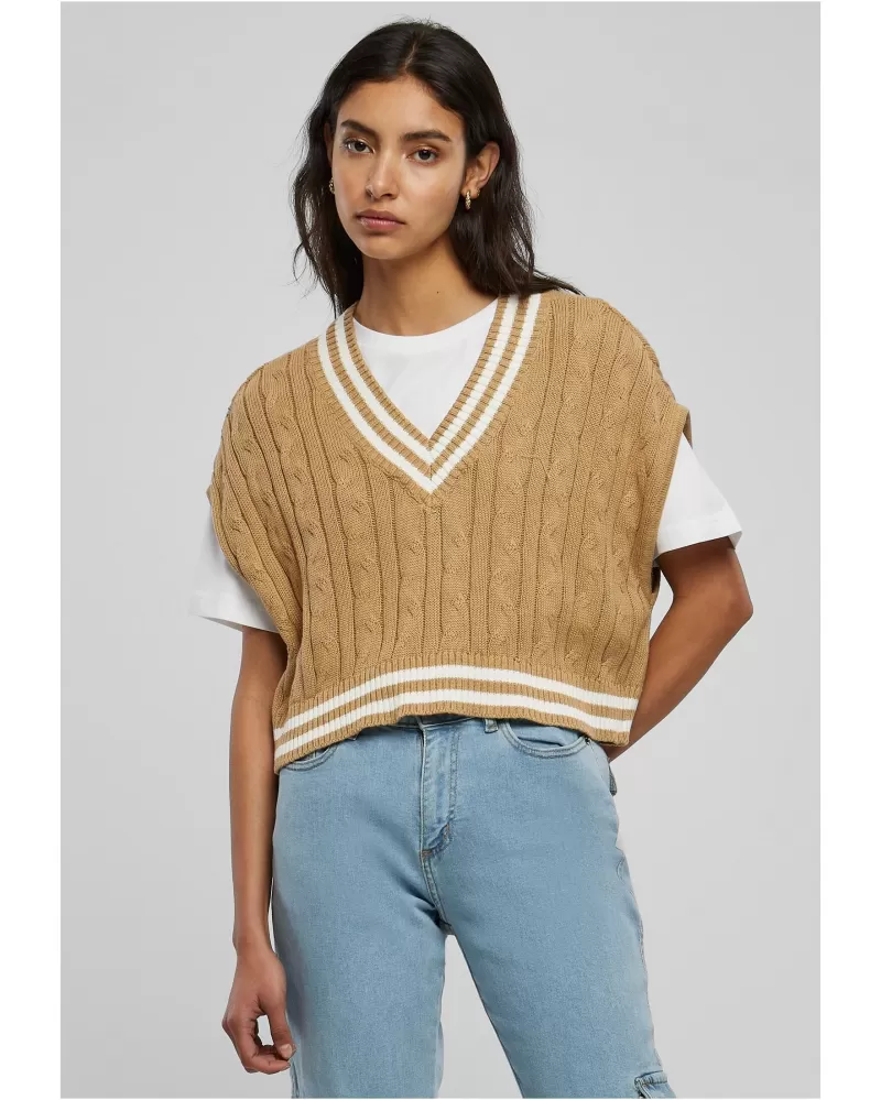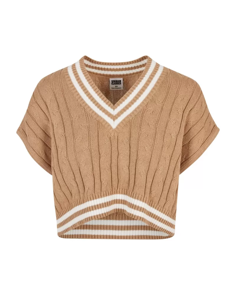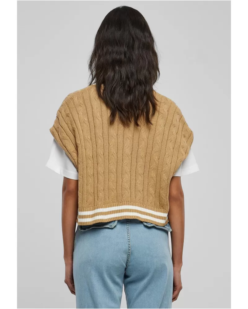 Tato superkrátká dámská pletená svetrová vesta je povedeným módním kouskem. Jeho široké, pruhované žebrované manžety na lemu a výstřih do V vytvářejí výrazné akcenty a připomínají slavný vysokoškolský styl. Zvolený vzor kabelového úpletu je pěkným kontrastem k celkovému designu. Ženský ležérní styl završuje jemné žebrované zakončení u průramku. Dámská vysokoškolská svetrová vesta je vyrobena z bavlny a má ležérní oversize střih.