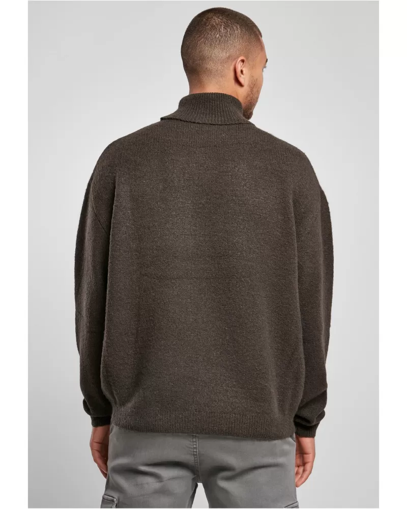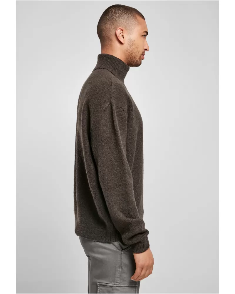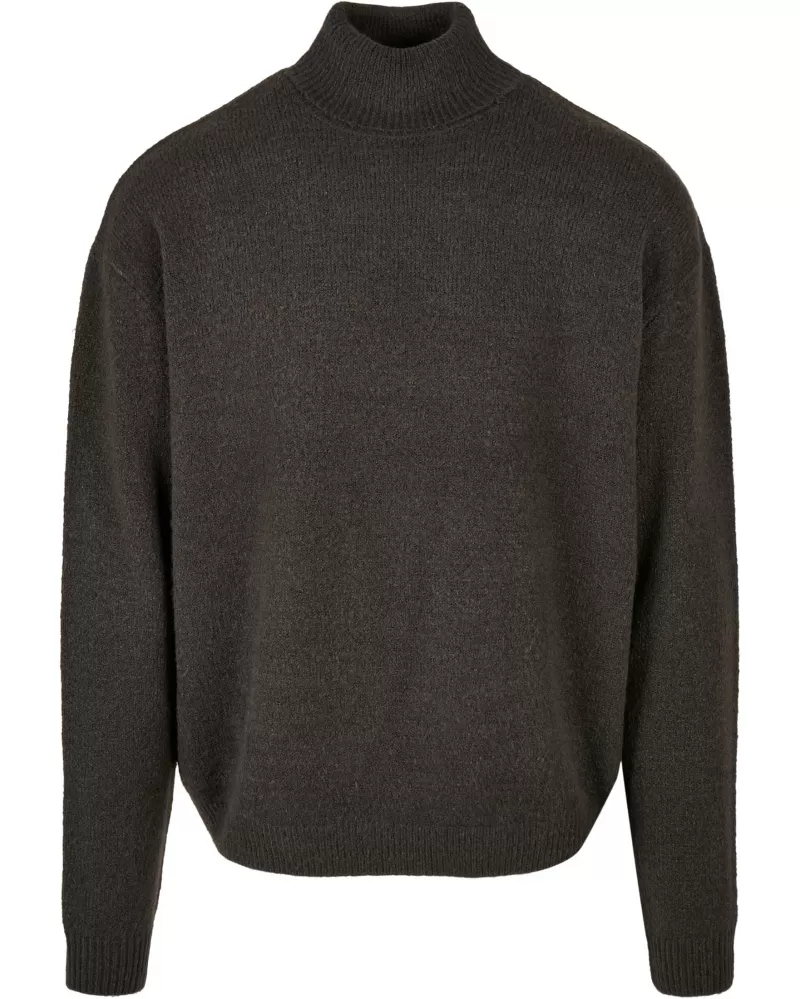 Pánský svetr v klasickém úpletovém vzhledu má vysoký žebrovaný rolák a elastické žebrované manžety na rukávech a lemu, které poskytují tvar. Střih je ležérního oversize střihu se spadlými rameny. Poddajný pánský svetr je vyroben z akrylu a polyesteru
