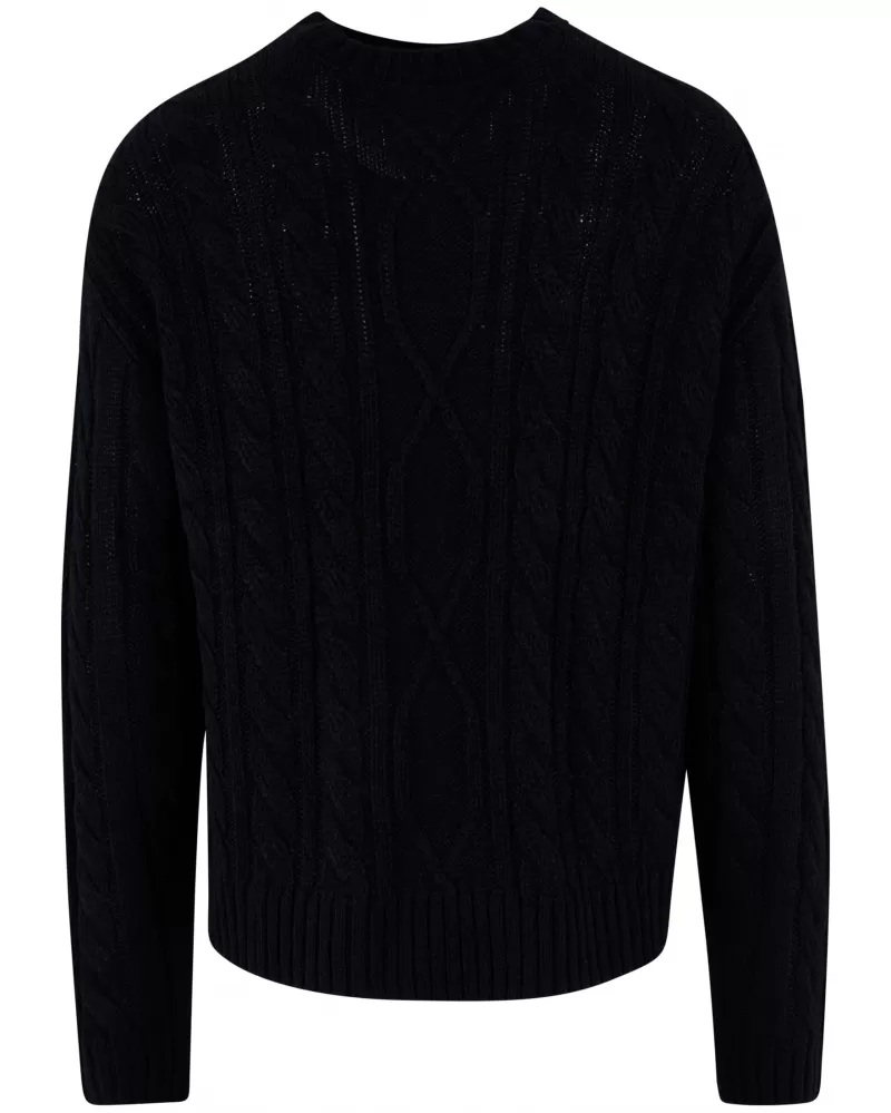Pánský pletený svetr se vyznačuje velkým kabelovým vzorem na přední a zadní straně a také jemnými žebrovanými manžetami na rukávech a lemu. Vkusný oversize střih se spadlými rameny mu dodává hranatý tvar a reinterpretuje tradiční vzhled, zatímco kulatý výstřih jej doplňuje. Svetr je vyroben z měkkého akrylu.