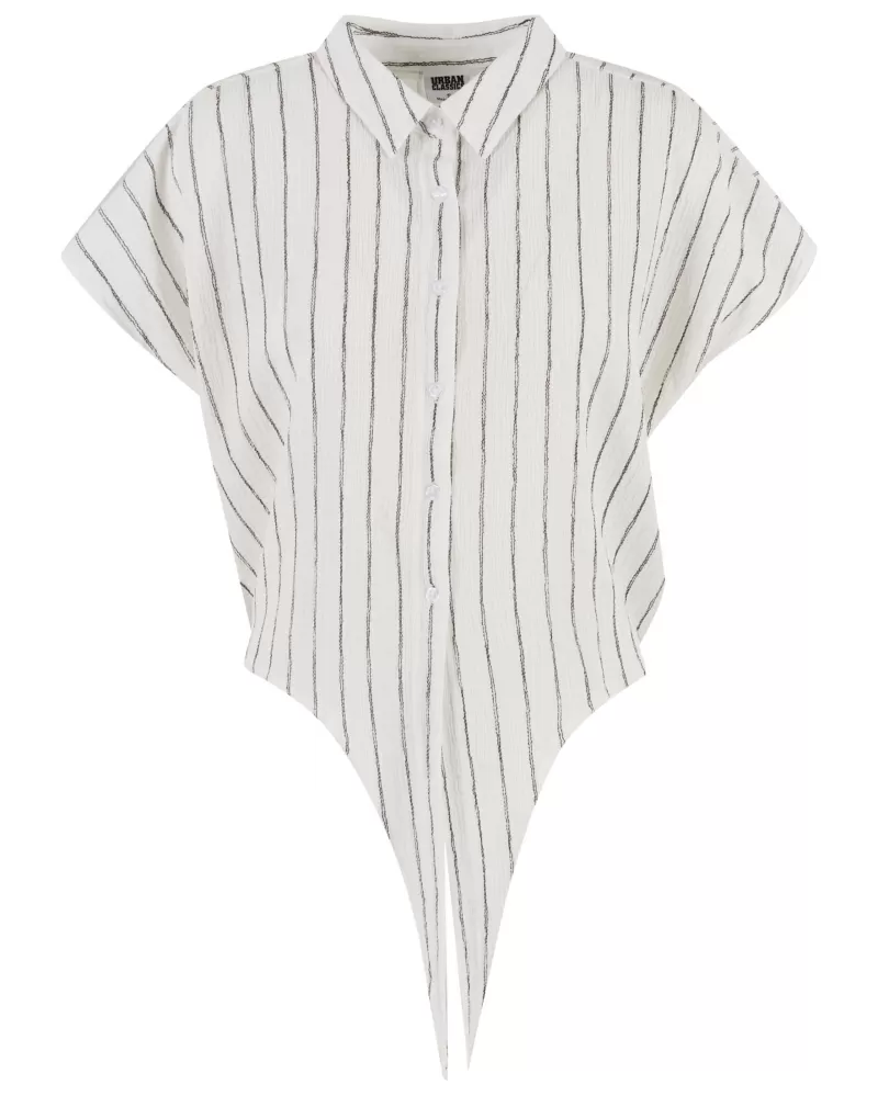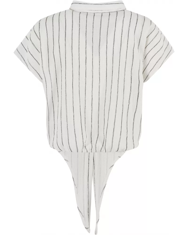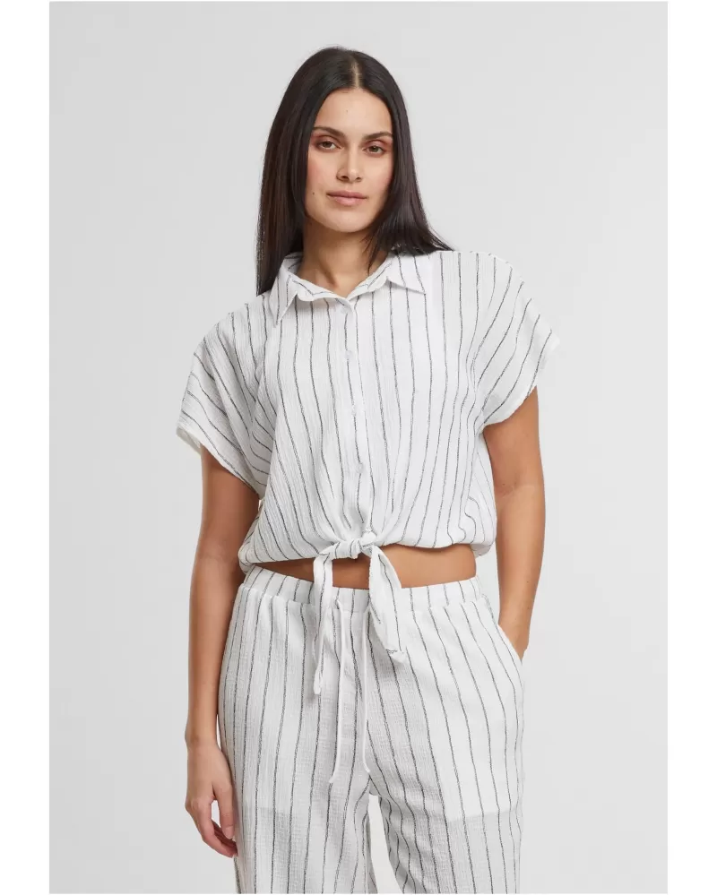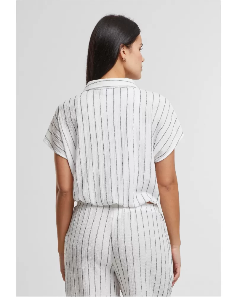Elegantní dámská blůza s pruhovaným vzorem a zavazovacím detailem na lemu. Volnější střih, klasický límec a krátké rukávy kombinují pohodlí s jemně strukturovaným stylem.