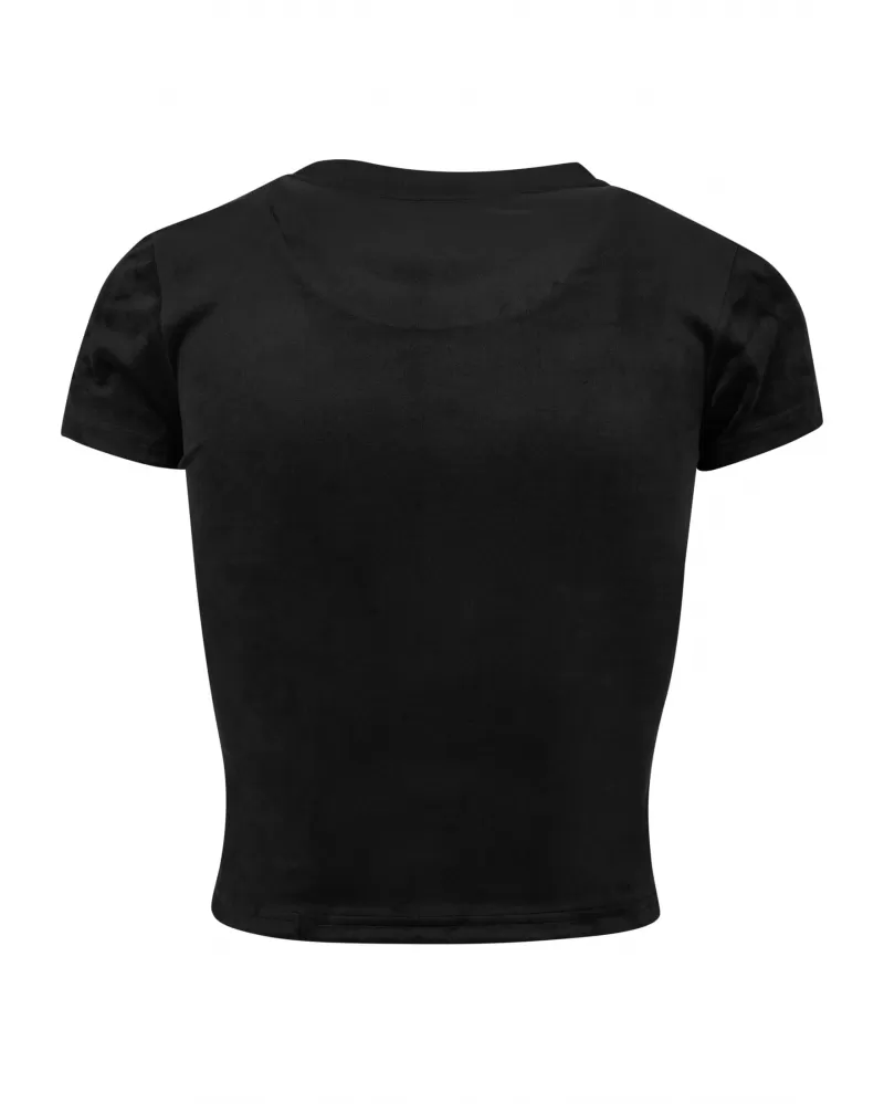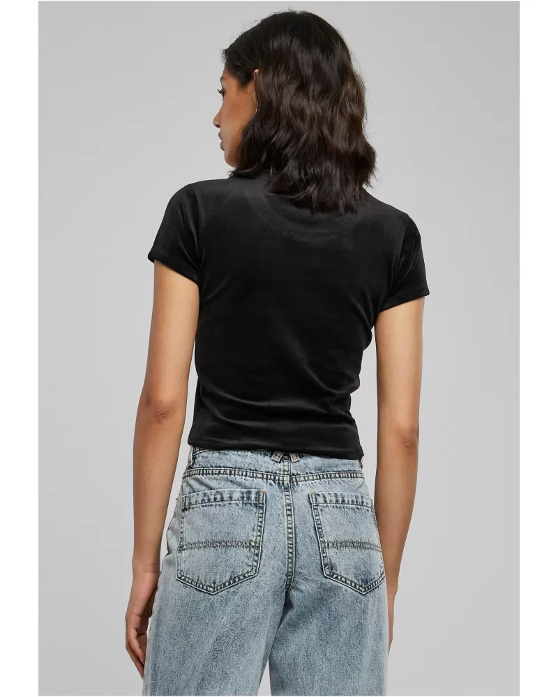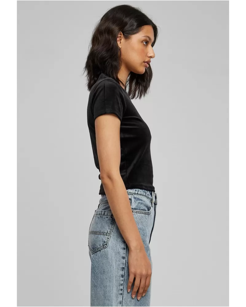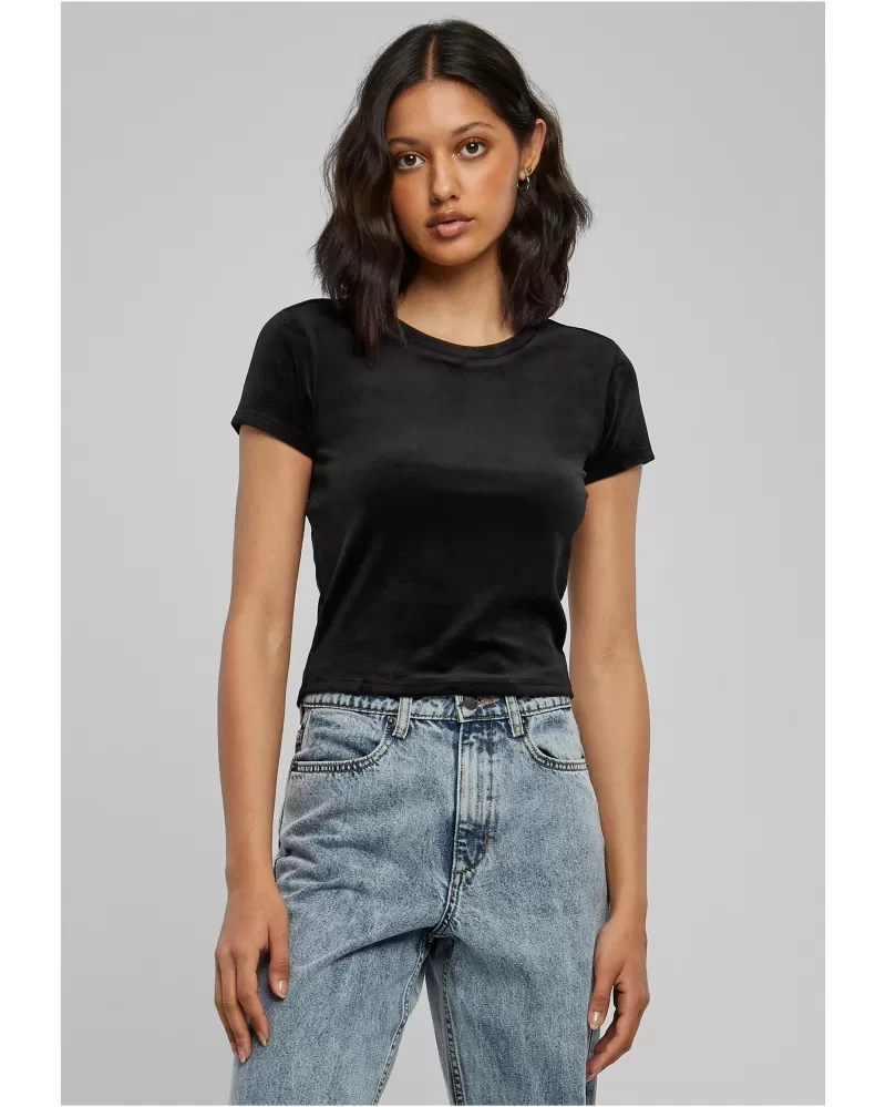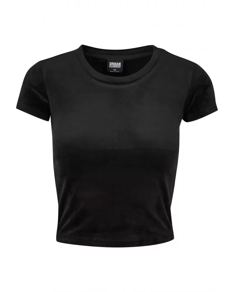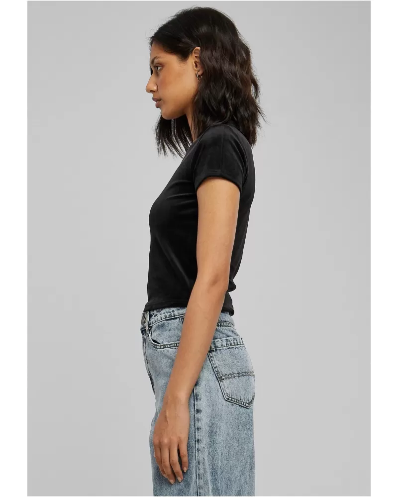 Jednoduché, ale efektní dámské tričko se zkráceným střihem a hladkým sametovým materiálem z něj dělá autentický módní kousek. Dále je vybavena klasickým výstřihem a krátkými rukávy. Dámský top je slim střihu.
