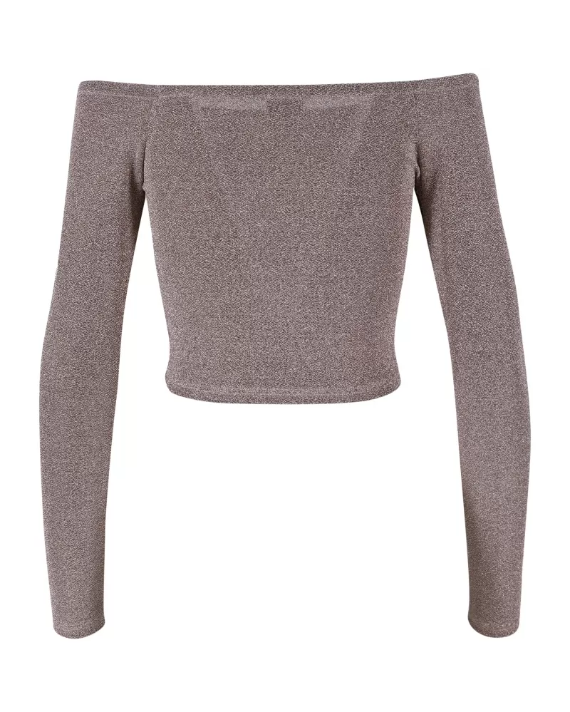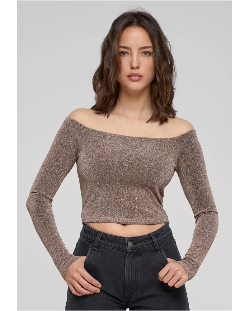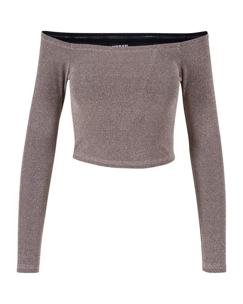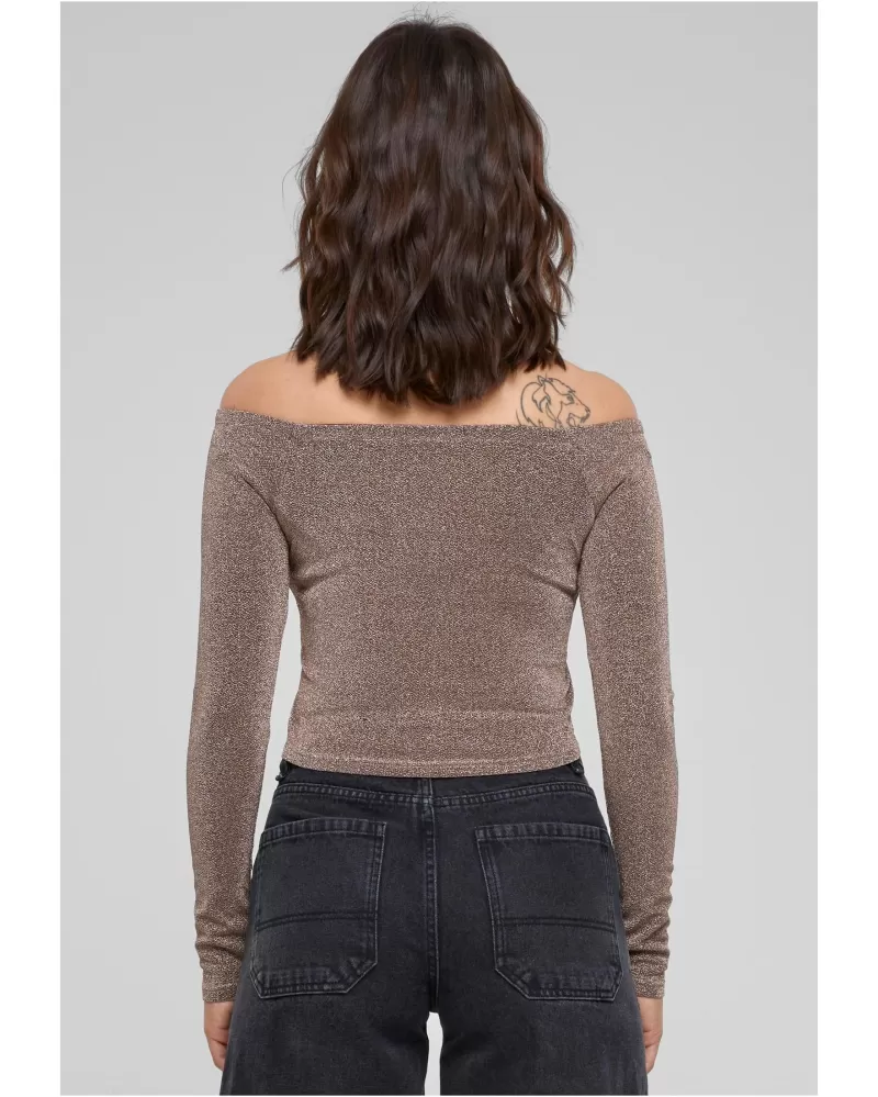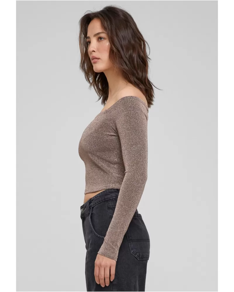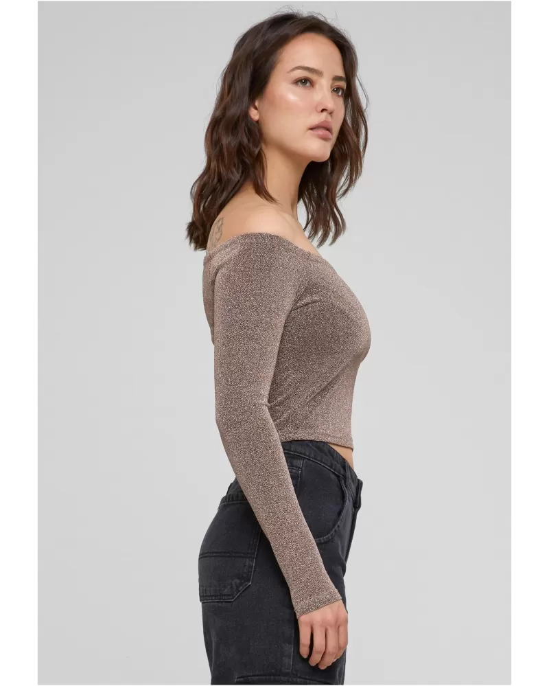 Dámský top okouzlí designem bez ramínek a třpytivým efektem, který je prodchnut jeho látkou. Integrovaná silikonová stuha zajišťuje bezpečné uchycení v oblasti ramen. Top má také dlouhé rukávy a sahá do pasu. Je přiléhavého střihu.