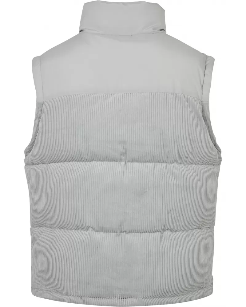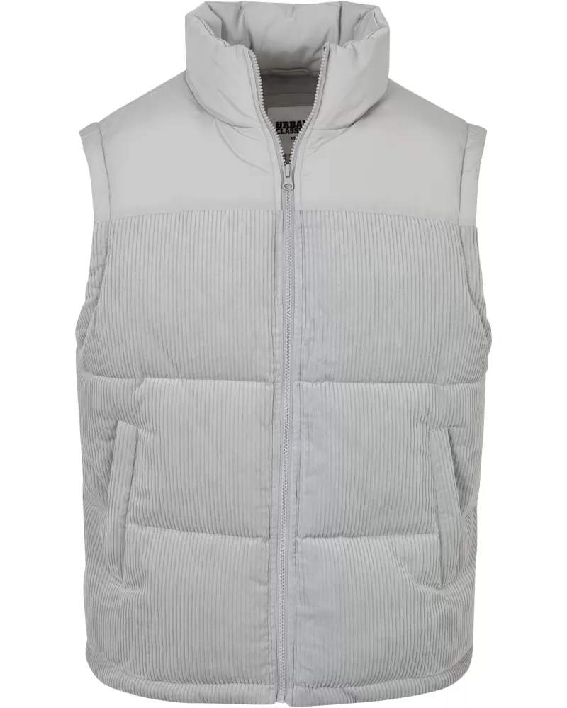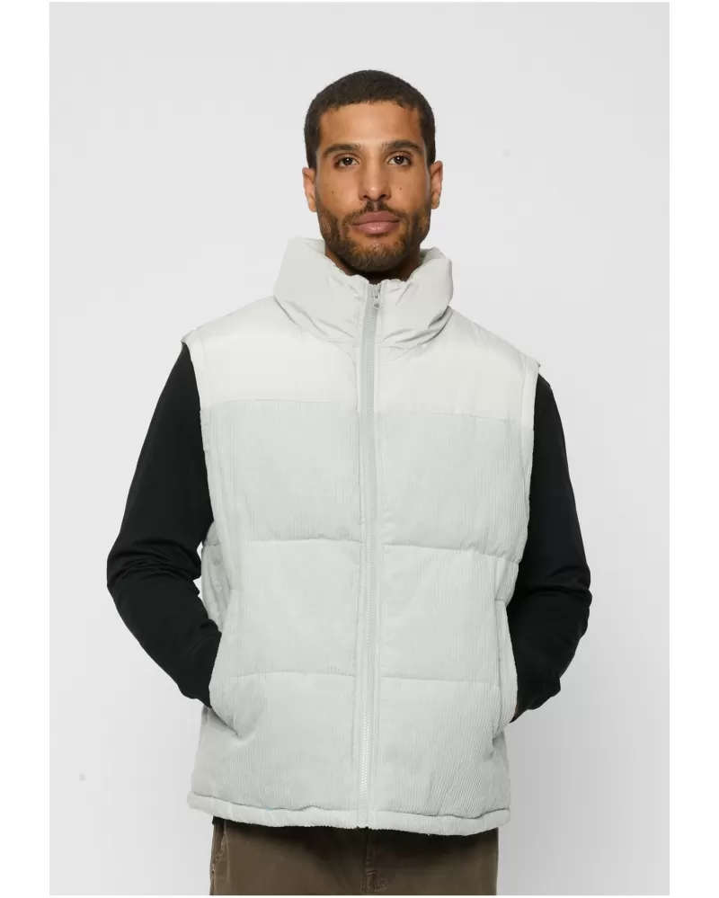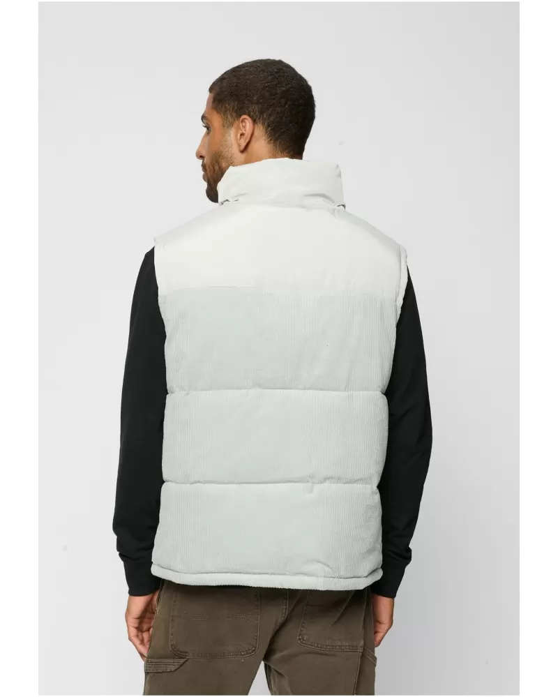 Tato pánská vesta kombinuje dva kontrastní materiály – manšestr a polyester – s hřejivou výplní, která vytváří jedinečný kousek městské módy. Jasně vyčnívají ramena a oblast stojáčku z polyesteru. Vesta nabízí další boční kapsy se skrytým zipem a je také na zip. Šikovným detailem je vnitřní kapsa. Pánská vesta je volného střihu a je extrémně pohodlná na nošení.